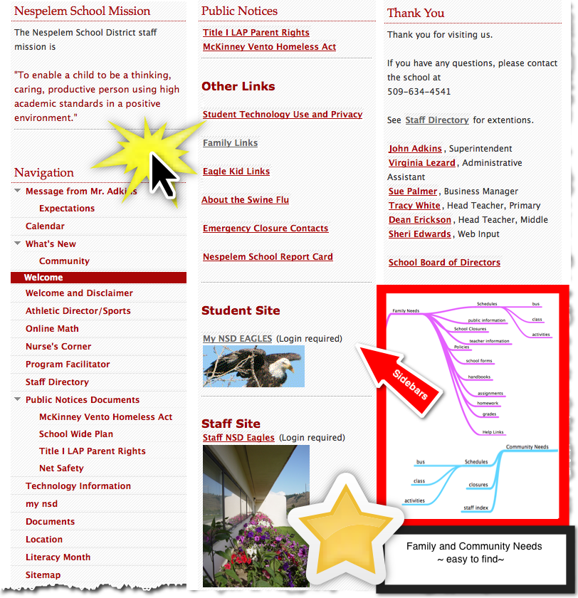 From those, I continued research to develop the texts and the flow of data. Three sites eventually emerged: a public school site, a staff site, and a student site. We needed two domains, one for the district and staff (nsdeagles.org), and one for the students (my.nsdeagles.org).