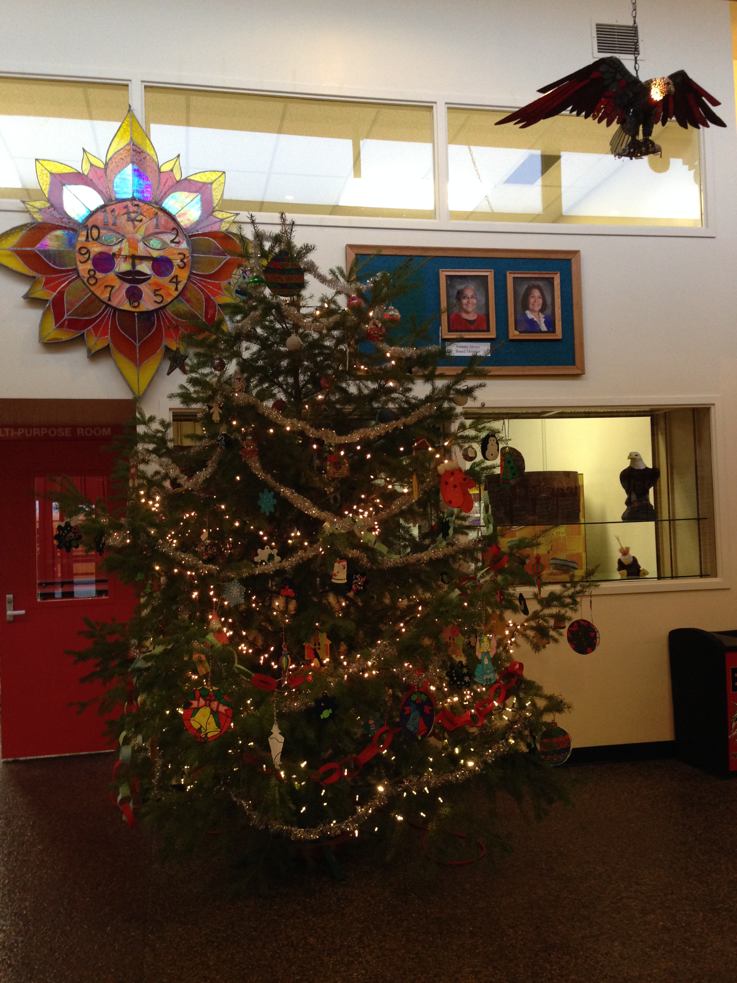 Holidays of all kinds occur around this time; traditions in so many different cultures. Our school is filled with choices for spreading cheer and sharing traditions, or just enjoying each other’s company. Some add decorations to a tree. Others add wall art to the hallway. Some draw portraits of their classmates. Others practice singing or dancing for a holiday program. Students take leadership positions and become Master of Ceremonies for a holiday program. Some bring in treats to share, like traditional fry bread, venison jerky, or salmon. The community is excited for the program, when each class performs in song, readings, or dance. Some classes sing or recite in one of the traditional languages.
