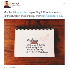 You can see all the #doodleaday prompts by Royan Lee here: https://sites.google.com/view/sketchlee/doodleaday?utm_content=bufferd3bbc&utm_medium=social&utm_source=twitter.com&utm_campaign=buffer It really is fun!