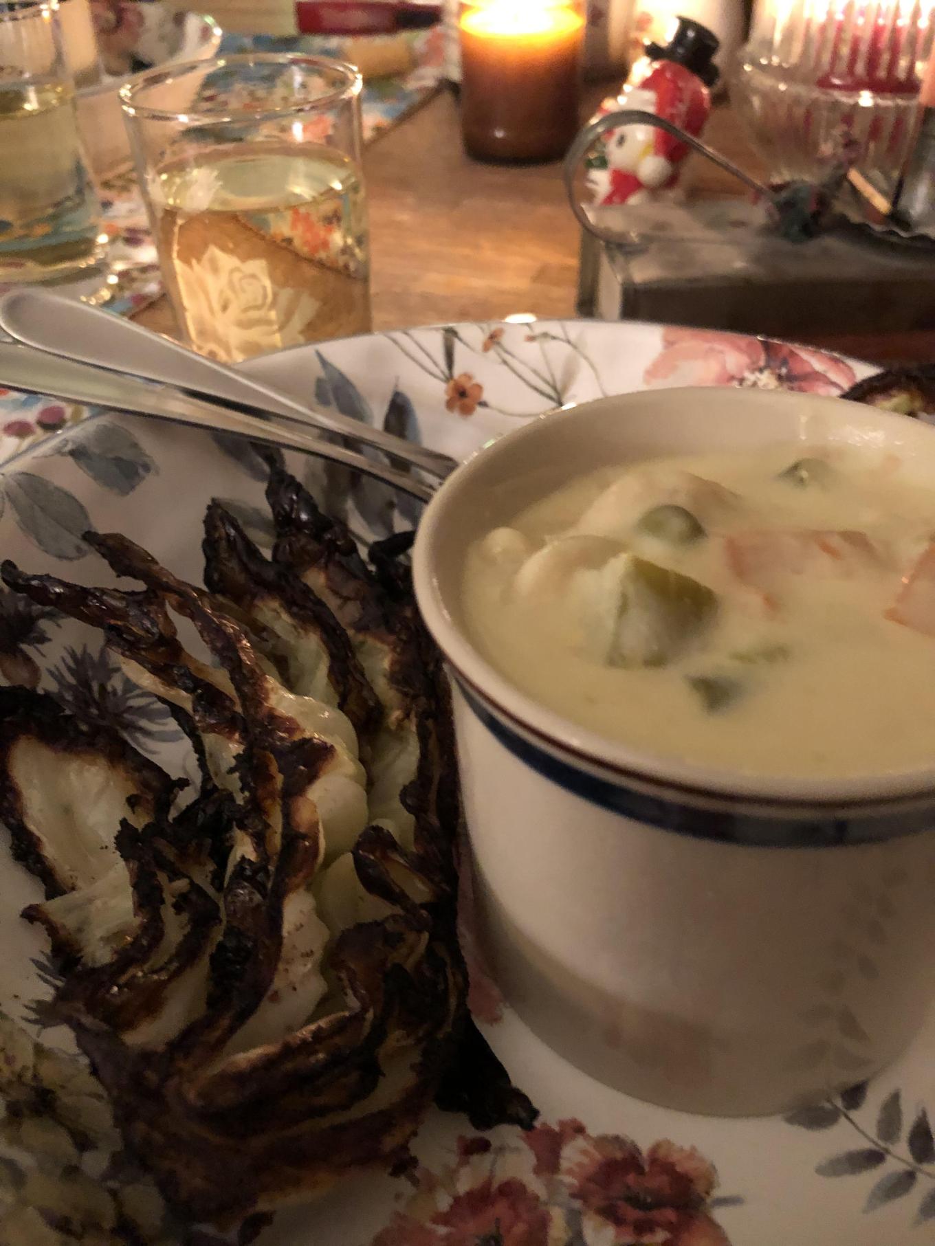 Creamy Chicken Vegetable Soup and Roasted Cabbage