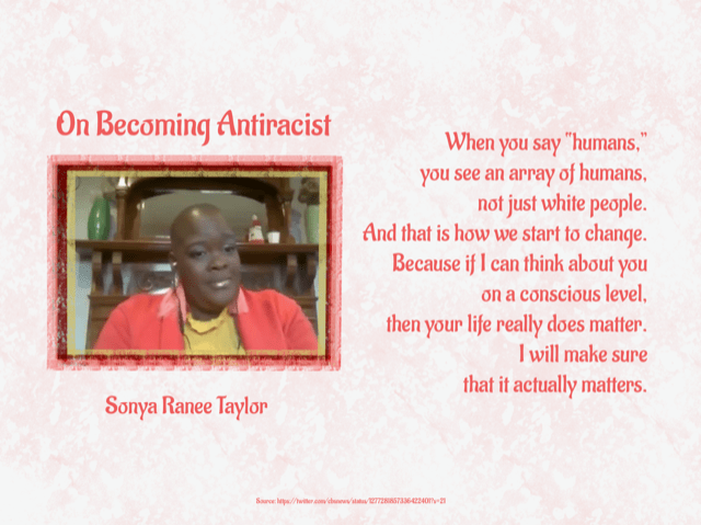 When you say humans, you see an array of humans, not just white people. And that is how we start to change. Because if I can think about you on a conscious level, then your life really does matter. I will make sure that it actually matters.