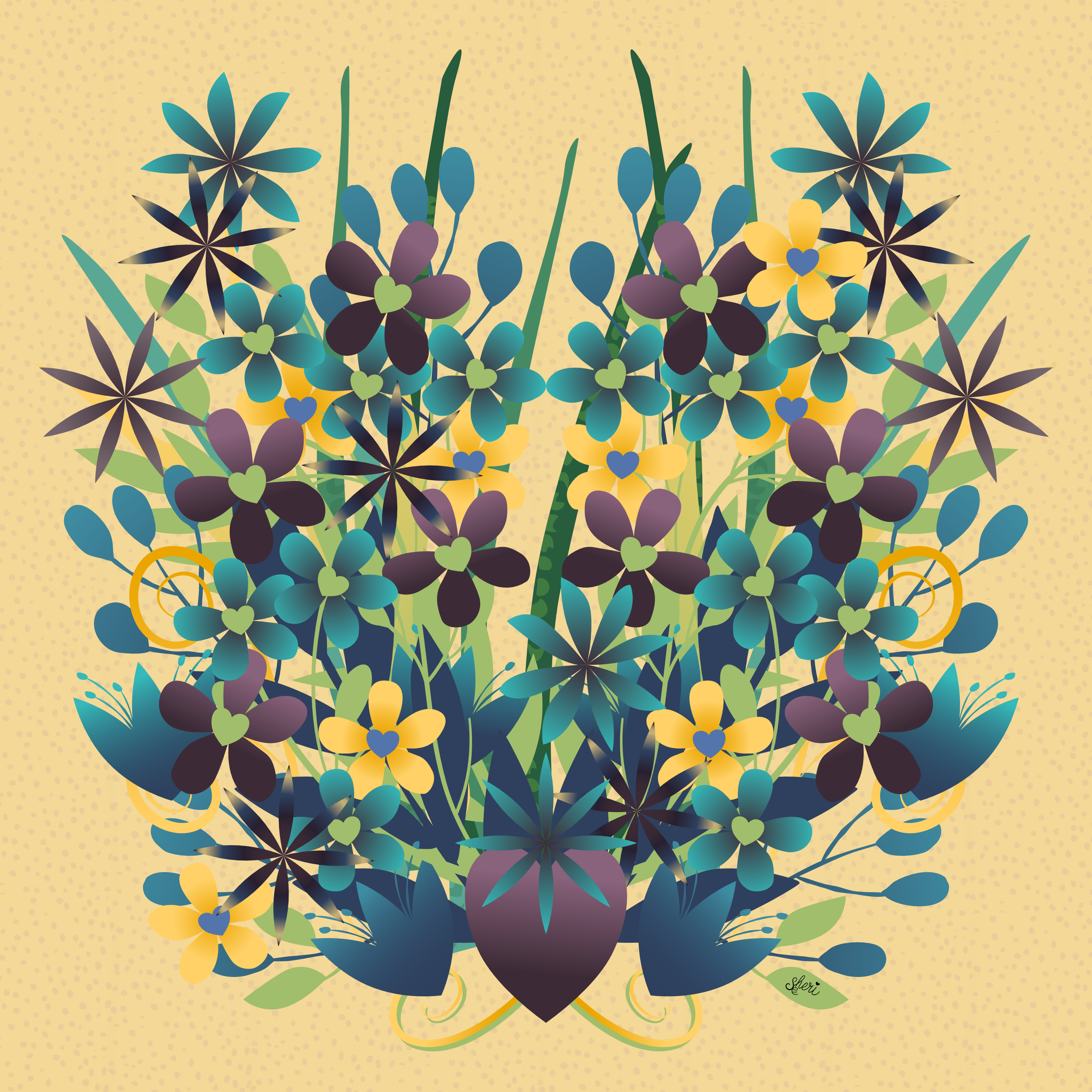 The app is Affinity Designer and the design is a vector illustration, which I prefer. I’m still learning. The symmetry is based on symbols created that are mirrored to each other. I learned this in Tracey Capone’s Skillshare class— it’s quite amazing how to set it up. Of course, I added off-symmetry elements to create a more natural look.