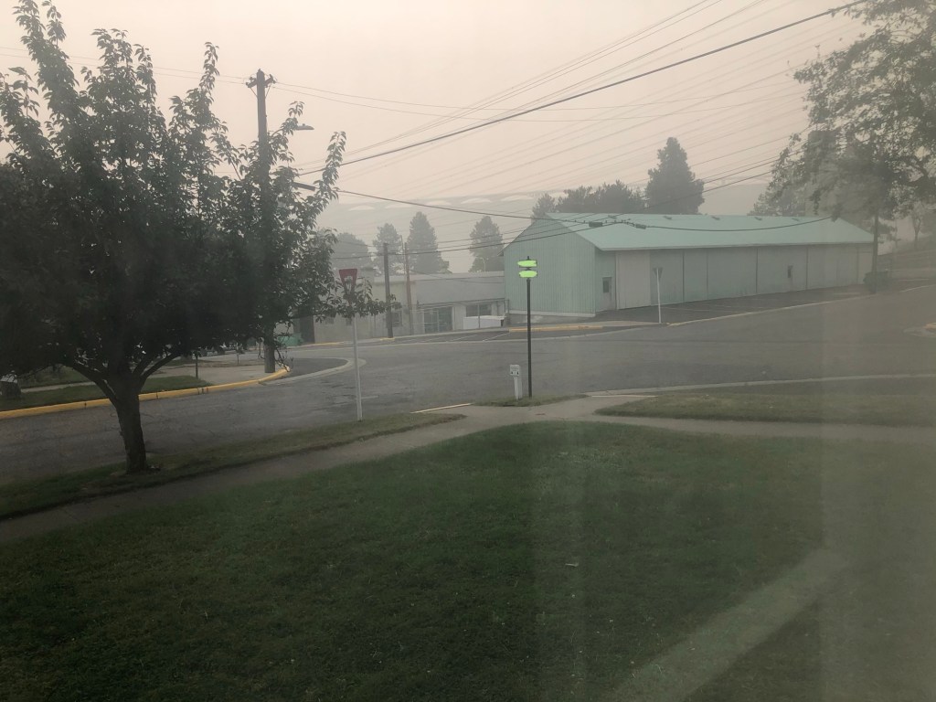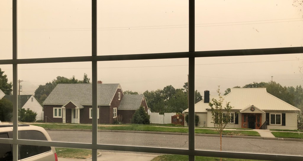 Finally, the sun shines through the smoke! I see sunshine and shadows! Still, at 291, the air is still hazardous in its smoke particles [Purple Air].