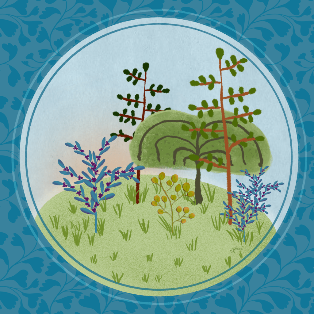 #Proctober’s Inktober today prompted practice in trees and shrubs. My husband says, “I wish there were plants with blue leaves and purple berries. Well, our sage actually has a bluish tint.” I just have to have blue in my pictures. It’s my favorite color. You’ll recognize the trees and shrubs from previous days– all easy to sketch in.