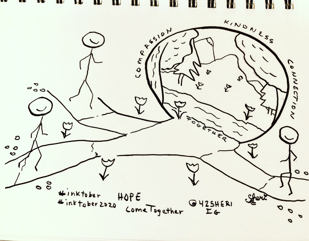 Today’s #inktober2020 prompt, “hope.” My inked drawing includes all people who want to work together for a better world, with compassion, kindness, and connection because, together, we can find the solutions needed for living safely and equitably through our compassion for one another. Those paths where we join together lead to a bounteous world for all of us.