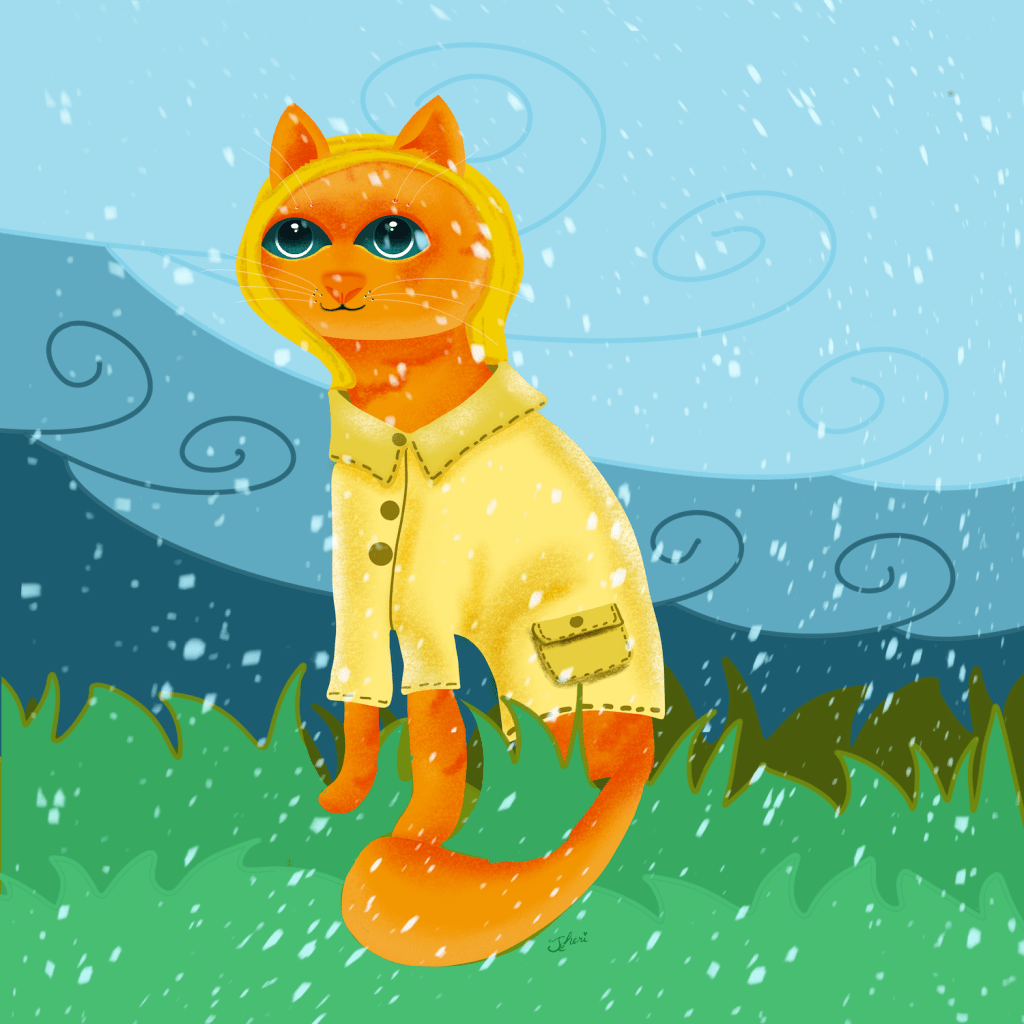 Today, the #doodleinstitute prompt, Raincoat, is one I’ve already completed for Day 7 for #PrOctober. So I decided to be a bit playful with this one. I learned to draw a cat from TatyWorks. So after practicing a couple times, I decided to create a rainy, windy day for an orange cat with a raincoat! You’ll be seeing this cat and others like him in the future as I practice the techniques of shading and drawing from this lesson.