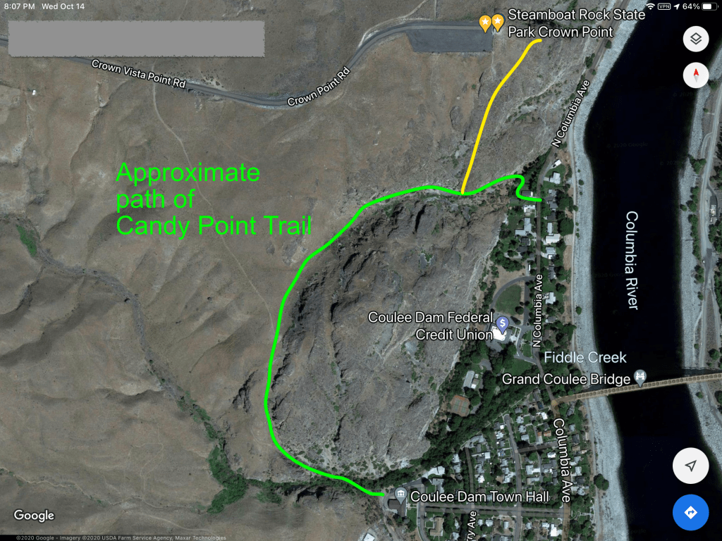 The view in the image is from an old trail called “Candy Point Trail,” which was built by the Civilian Conservation Corps in 1937 and updated by the Grand Coulee Area Rotary Club in 1991. It was spruced up again by the Washington Trails Association in 2017.