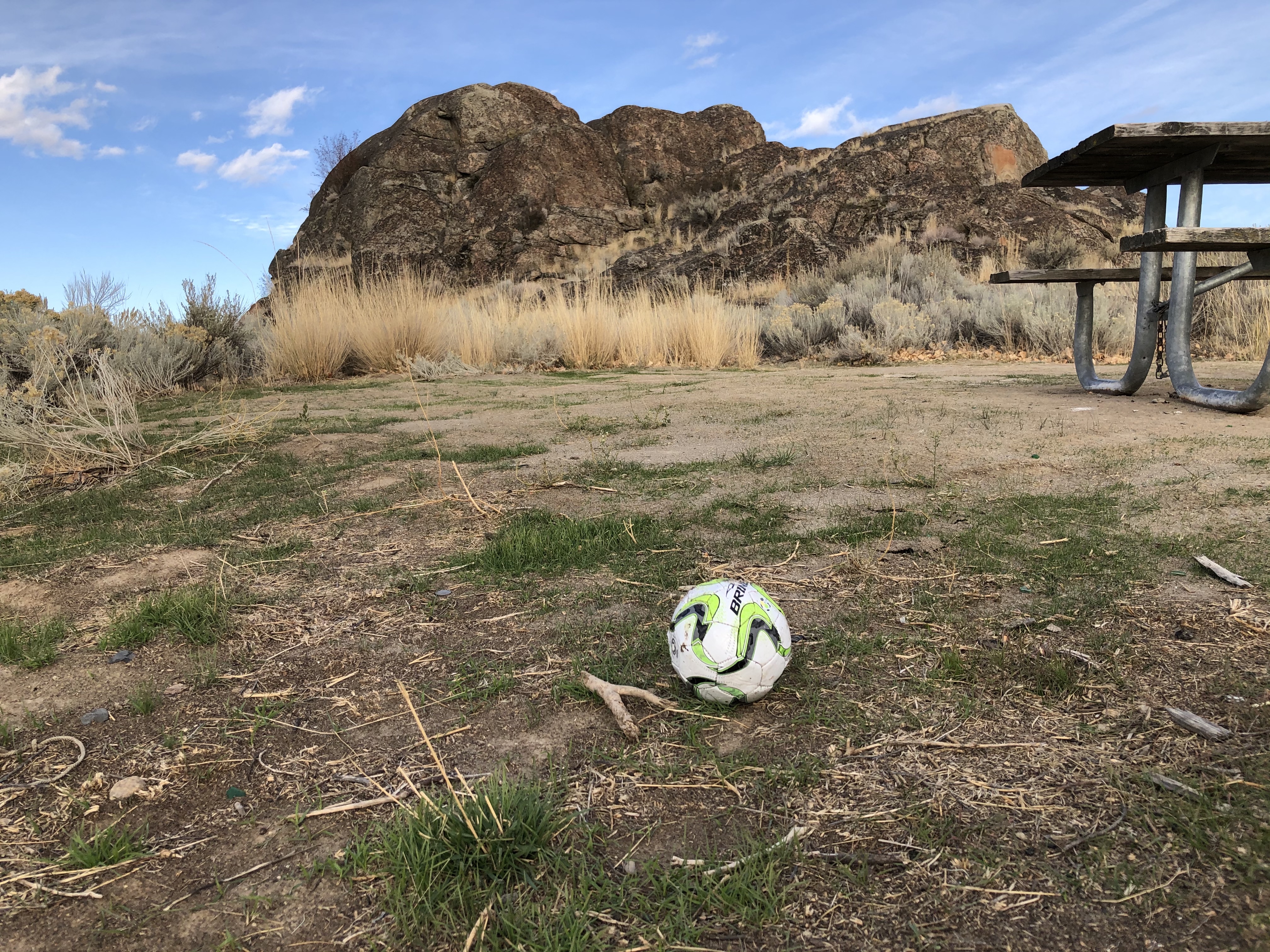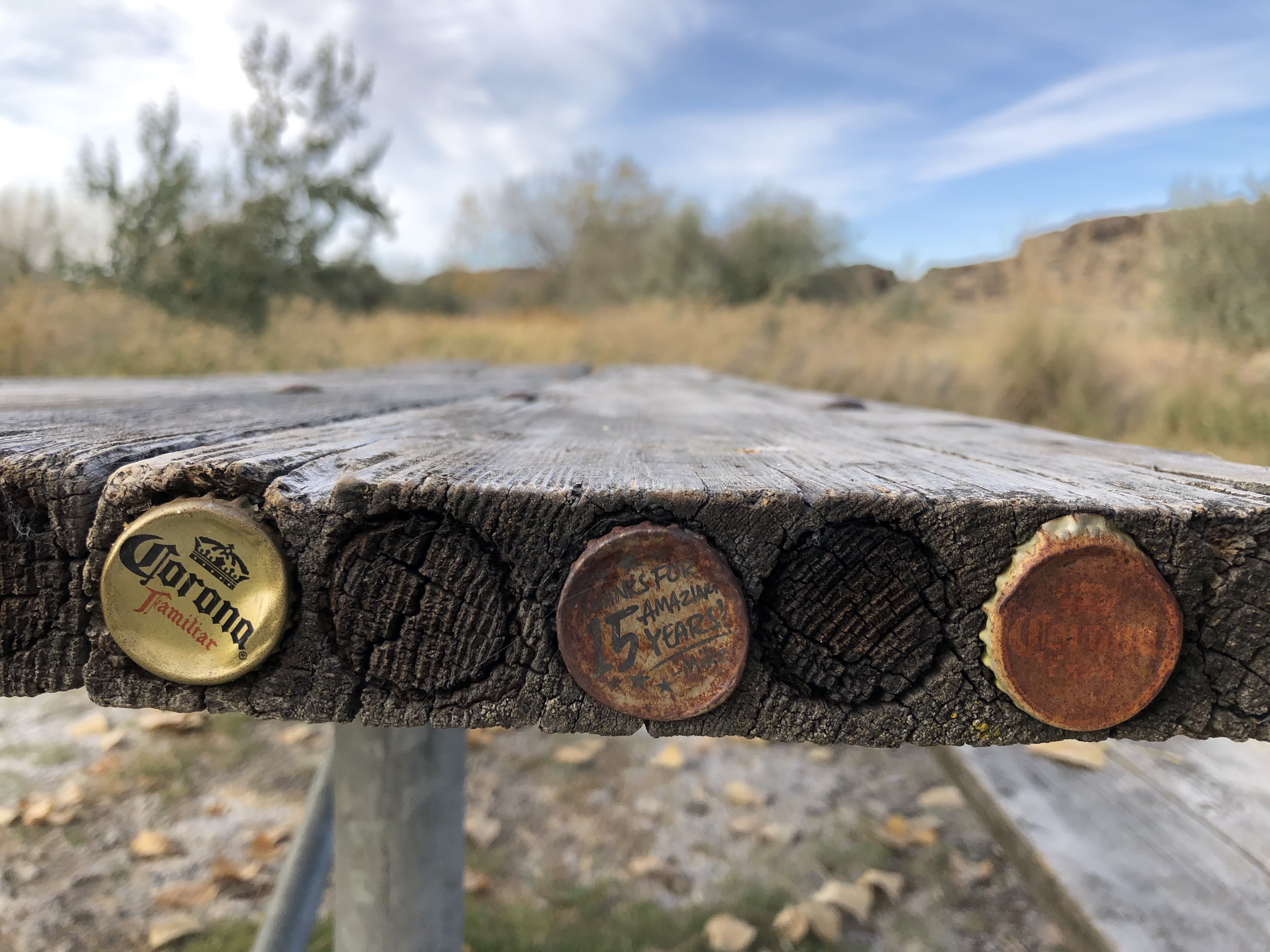 Vandalism turned art— circles on the edge of the picnic table