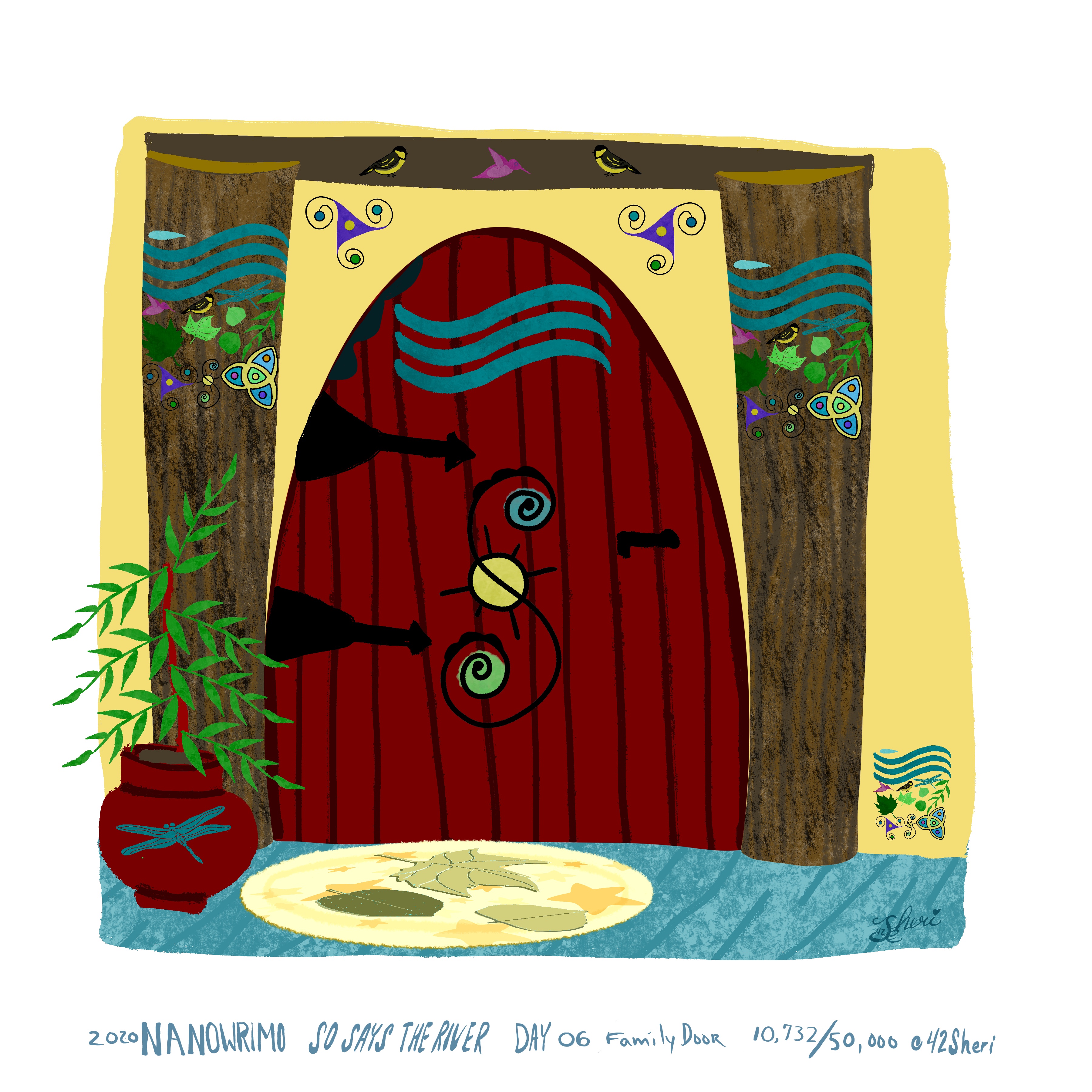 On each wooden post bounding the doorway, a single droplet of water, floating sideways topped the same three wavy cloud icon. Below those hummingbird and chickadee welcomed visitors along with dragonfly. The pleasant traditional leaves of maple, sycamore, aspen, willow, and birch fell next, a blessing tying earth and sky together. Next, the three family crests— each it’s own version of a story and belief in its own arrangement of threes. And at the top and bottom, left blank, a space for the unknown to be known, ready to welcome the new to join with the old.