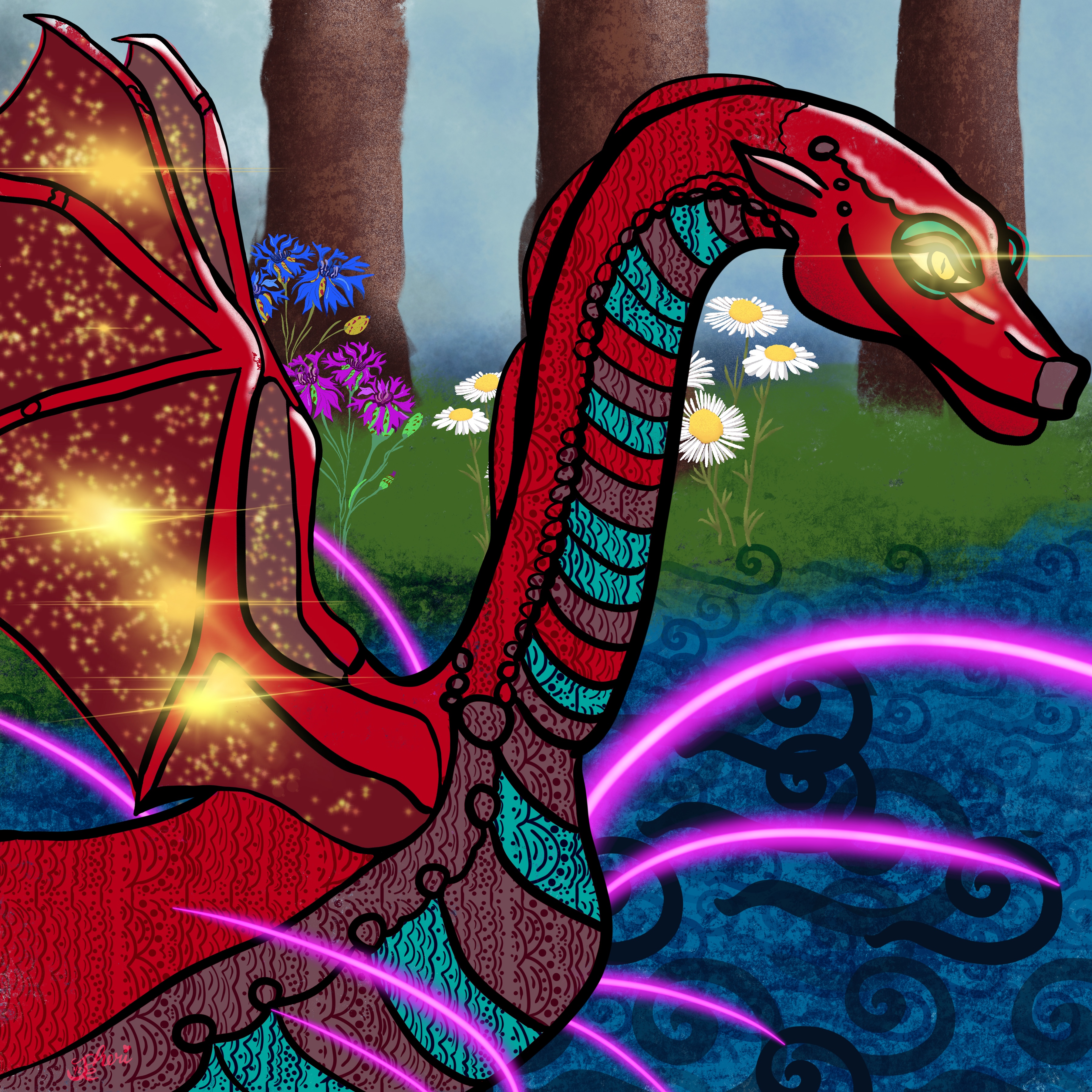 A few more pink streaks streamed out of the hole and settled around the outer limits of the spring. From inside the hole a clawed and scaled red arm reached up and slapped into the pond, followed by the head of a rose red dragon slipping upward and upward with its entire body, stretching its wings out, settling them beside its immense body to float level with the water in the pond, sitting down, tail searching and then wrapping around the overhanging branch of a pine tree. It cleared its throat and blinked.