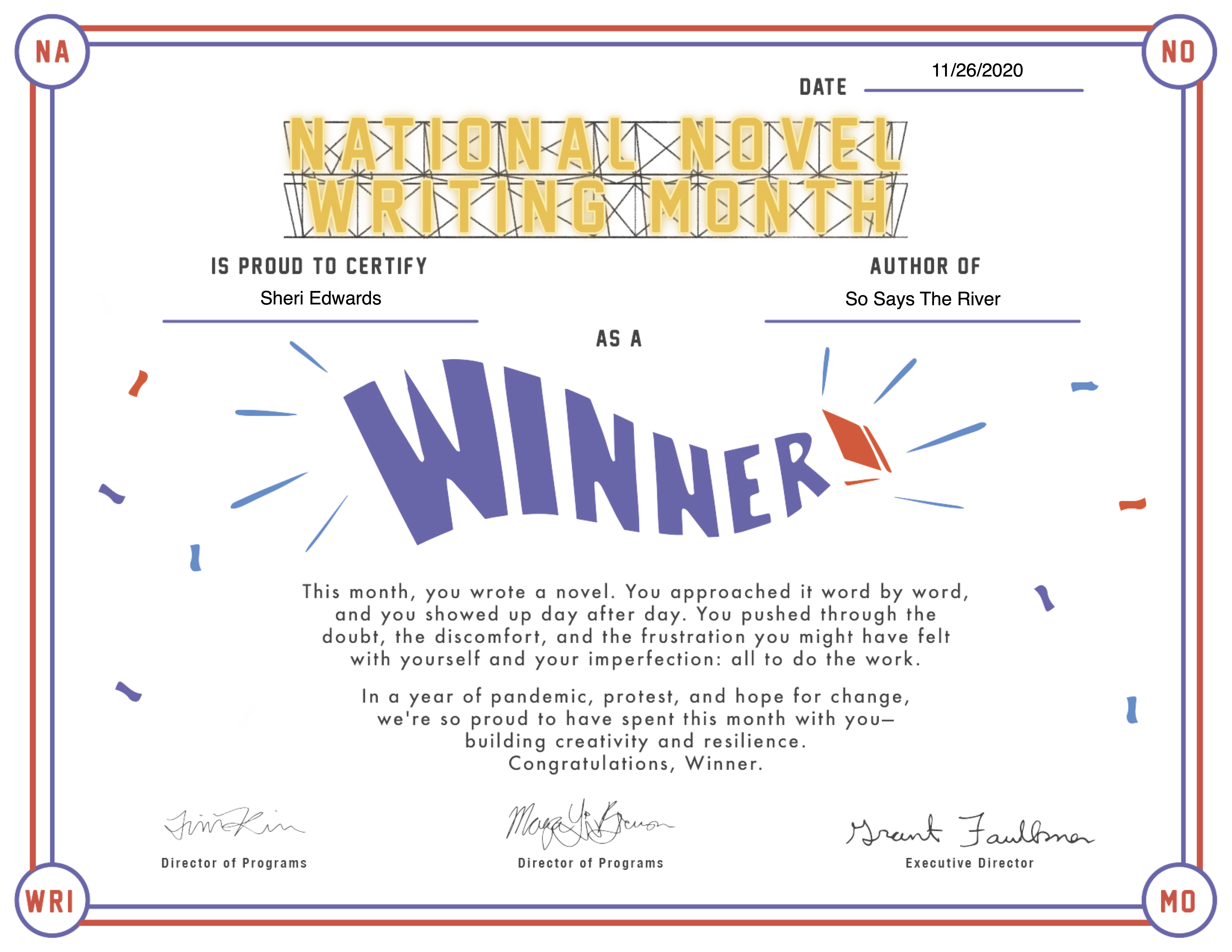 NaNoWriMo: National Novel Writing Month — Day 26 with 50,402 words of 50,000 over the month of November. Four days early! 🙂