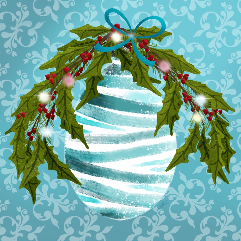 Day 19 of #iPadVintageOrnaments — a few boughs of holly and festive lights surround an ornament glowing in white and blues. This one was fun to create– and I love how the holly berries turned out.