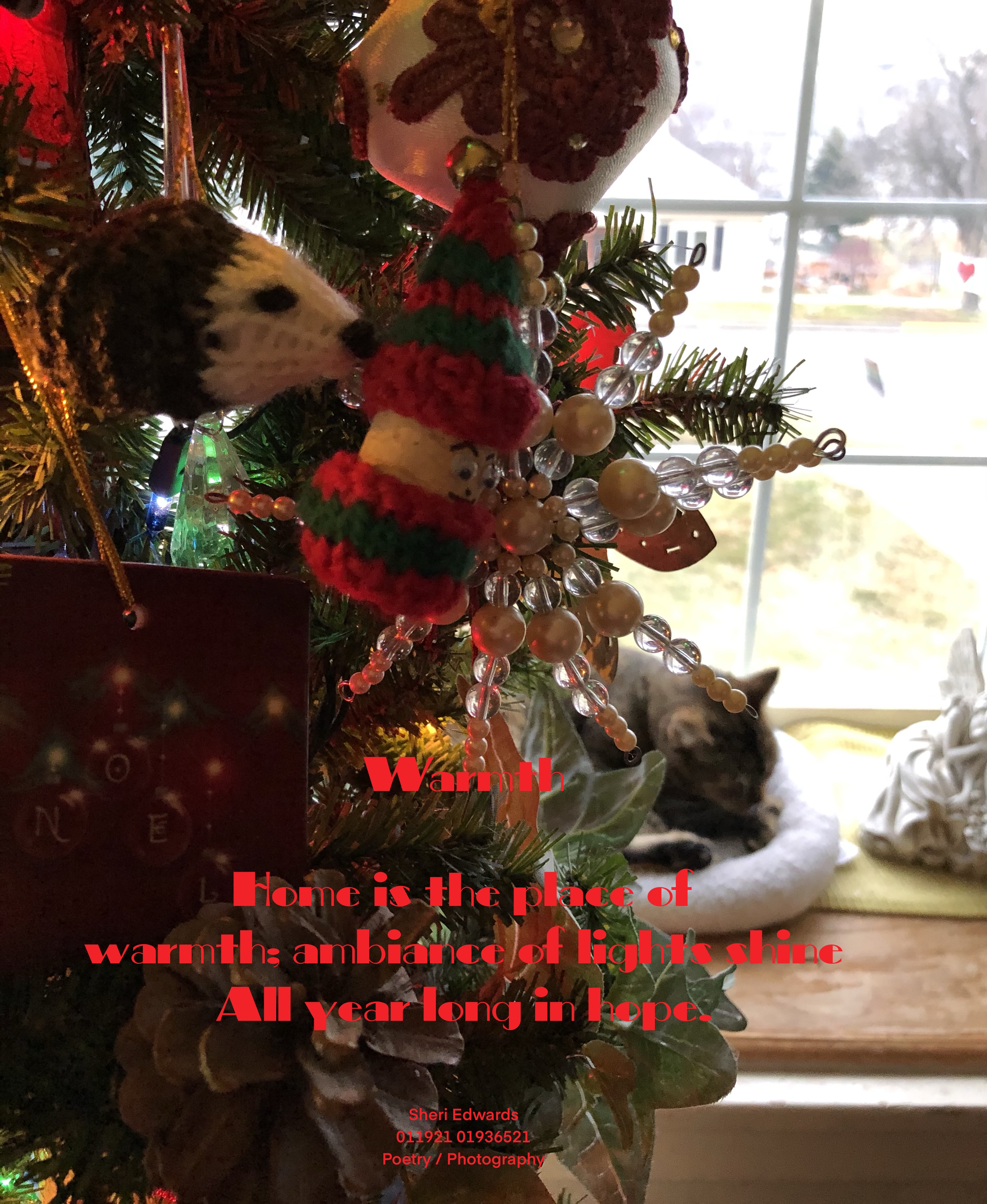 A Daily Challenge to myself: a photograph and poetry. Today, just a look out the window at a familiar scene: the tree light all year ’round, the cat in the window, the fairy globe waiting for sundown to add another warmth to the friendly, calming lights.