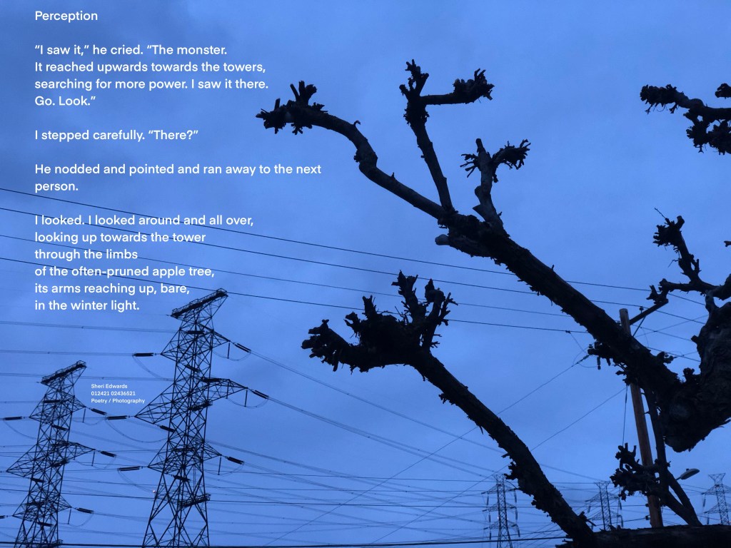 A Daily Challenge to myself: a photograph and poetry. The evening walk through the crisp cold of a blue sky with silhouettes of the apple tree prompted a poem of perception.