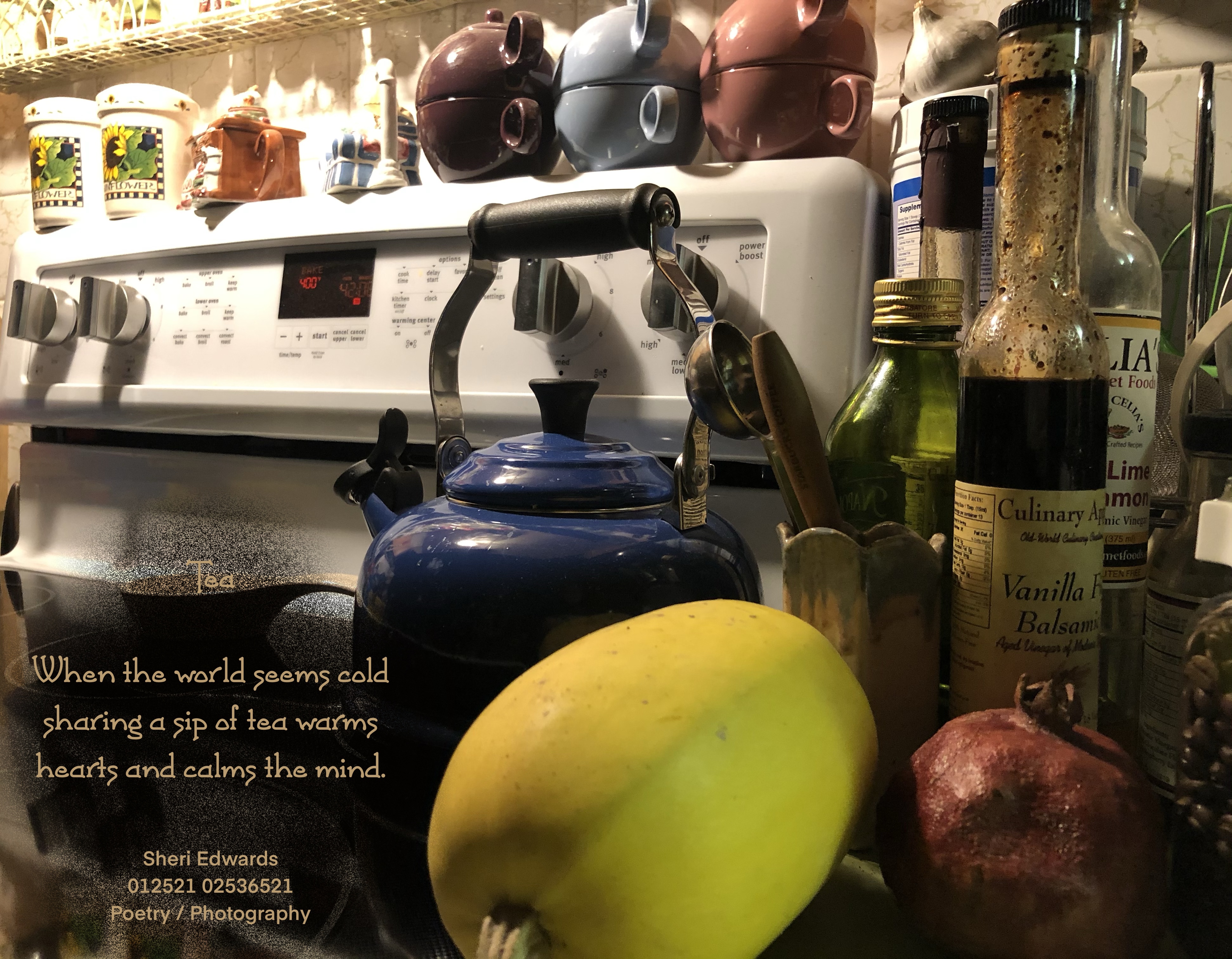A Daily Challenge to myself: a photograph and poetry. Today, no walk. Both of us were so busy with our work, which is unusual for me. Plus, I am helping to start a private blog for our book club– and everyone in the club is a novice with technology. So, I needed to get directions ready and be on call for help. I think it will be fun, and I hope they like that our conversations can still happen during these covid times. So, tea. Always tea.