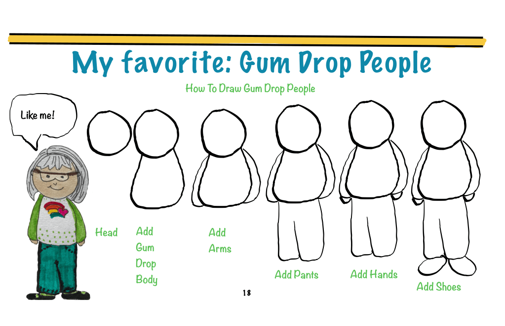 While I can draw bean and gum drop people, I struggle with characters, but I’m getting better. I’ve even taught my family to doodle gumdrop people, which I learned from Diane Bleck of the Doodle Institute.