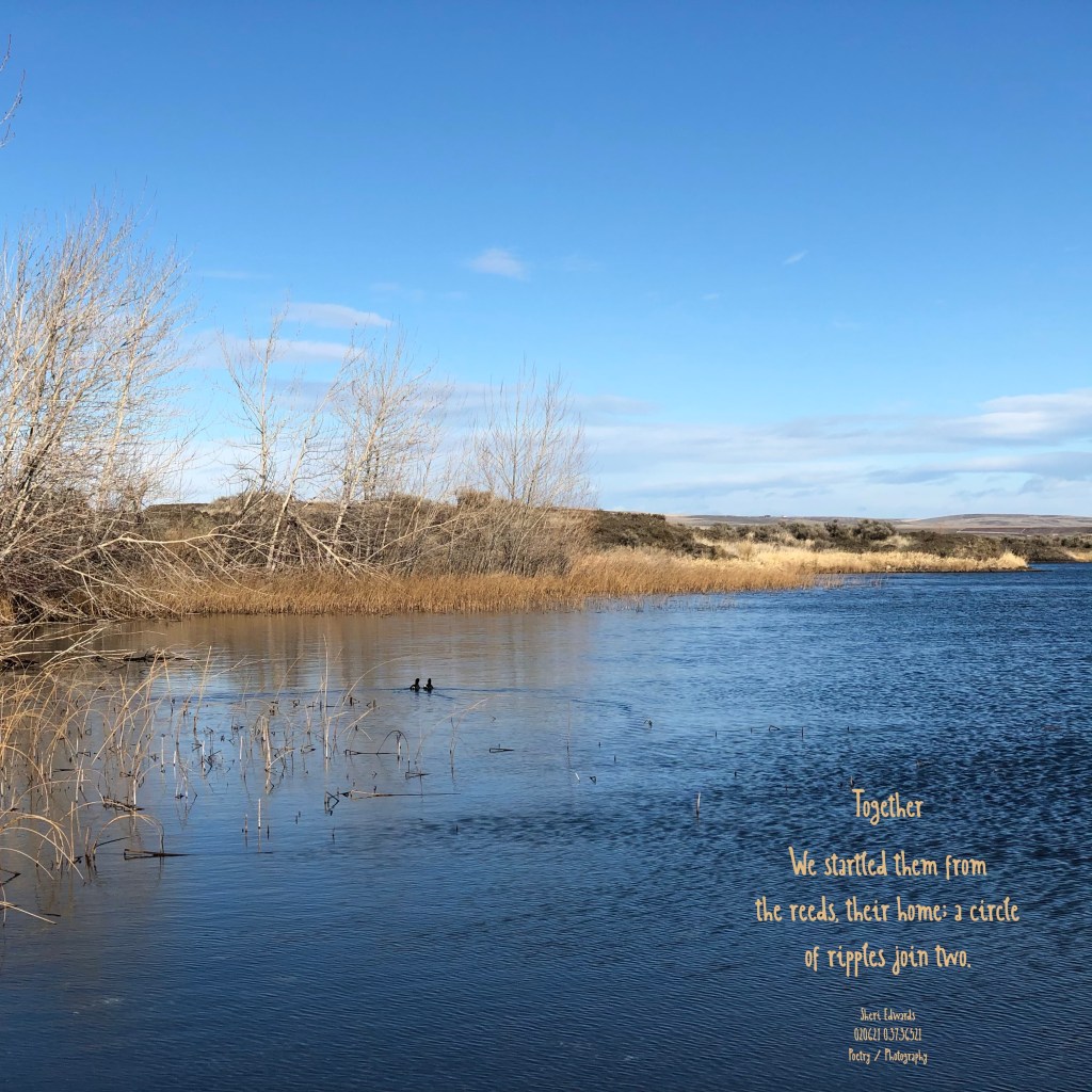 After eating, we walked around the area, enjoying the still brown, gold, and rust views. Near the beach area we startled some water fowl who swam away, apart, but quickly circled back together again, swimming along the shore away from us. So, the poem: