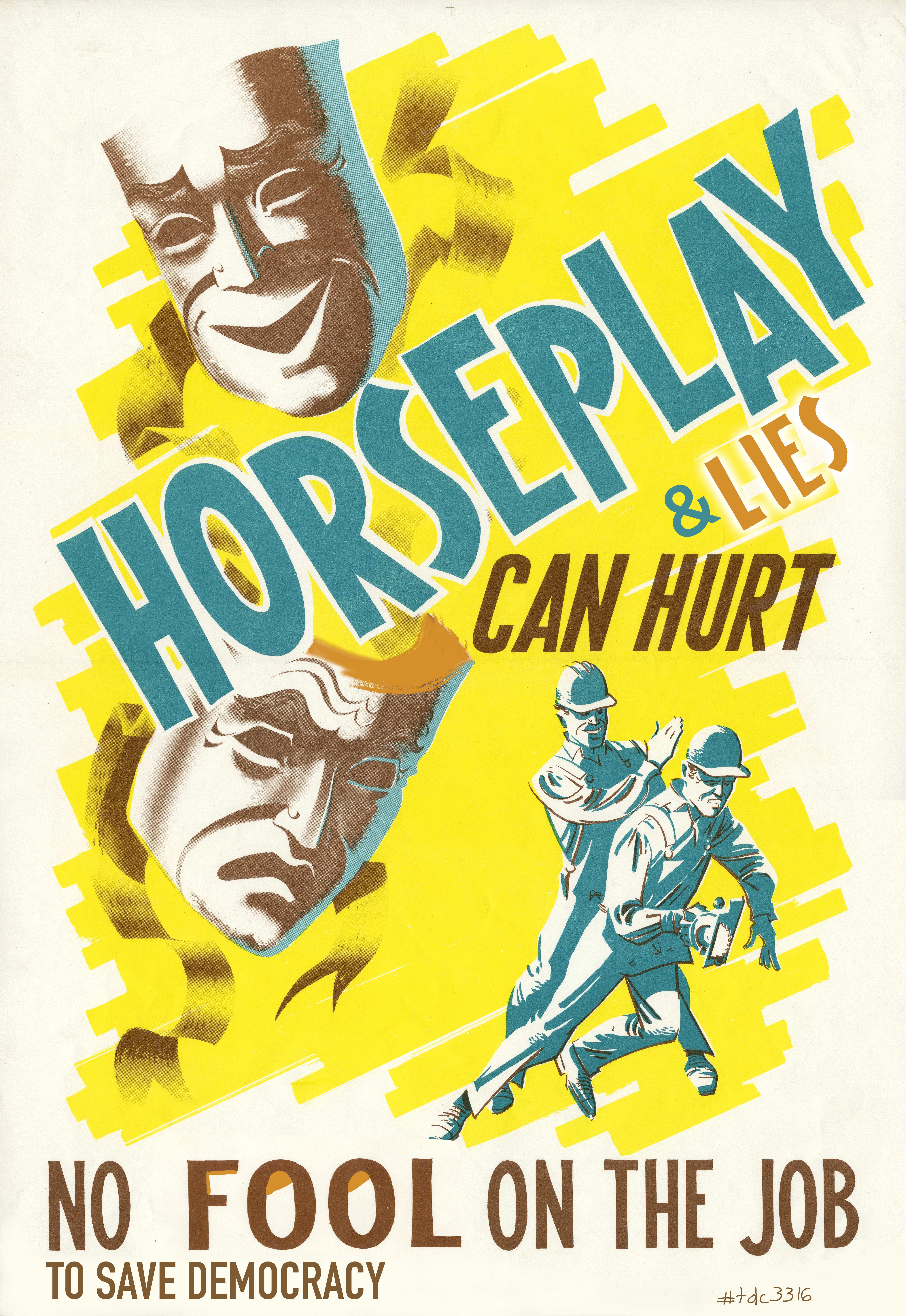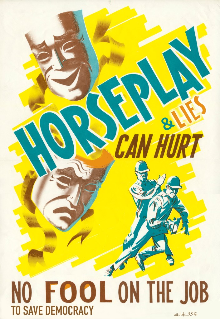 Once again, I searched the Flickr Commons for some safety sign I could adapt and found one on no horseplay on the job. The poster, from long ago, shows how workers needed to be reminded of what we would now call “bullying” rather than horseplay– if it is a continuous action by one person to another.