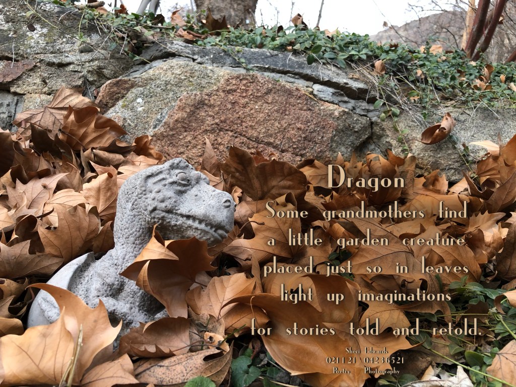 Today a walk through the yard, still full of sycamore leaves, brown and crunchy, displayed peeking out from the bronze pile of leaves, the dragon just popping out of her egg, waiting to tell another story.