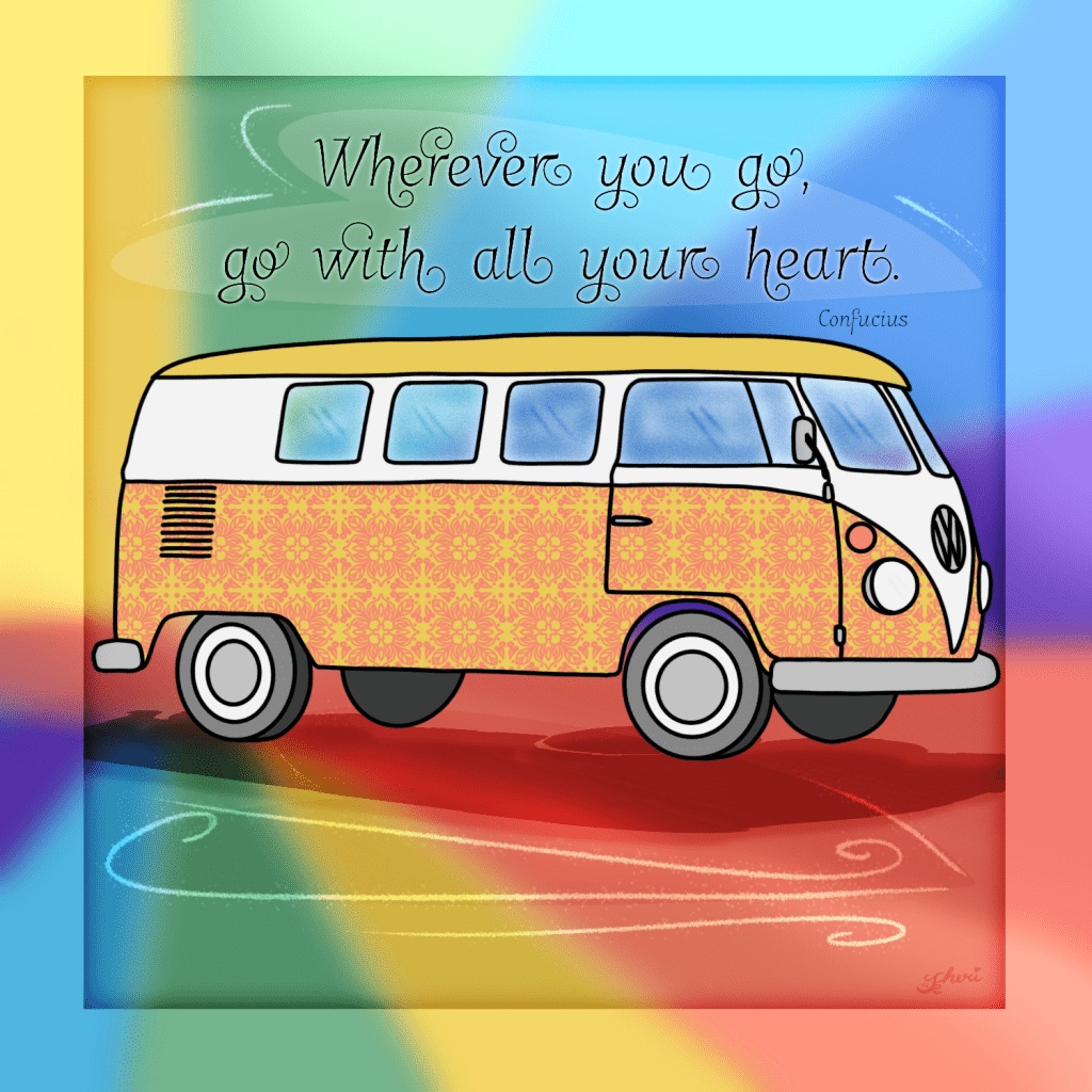 Continuing with the February “love” and “heart” theme, I created a VW Bus with a floral design and a quote to encourage a journey taken fully– the goal, the journey, the destination.