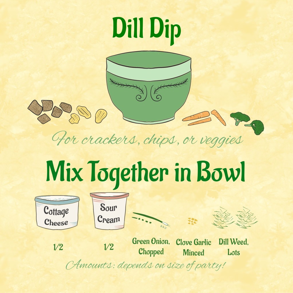 Mix covers a lot of ground, but it fits right in with my “recipe” doodles. And this one is perfect for “mix.” Just gather the ingredients and adjust to the size– from one cup to many– and mix together for a simple, yet delicious dip for crackers, chips, and veggies. Mix up some Dill Dip! Enjoy!