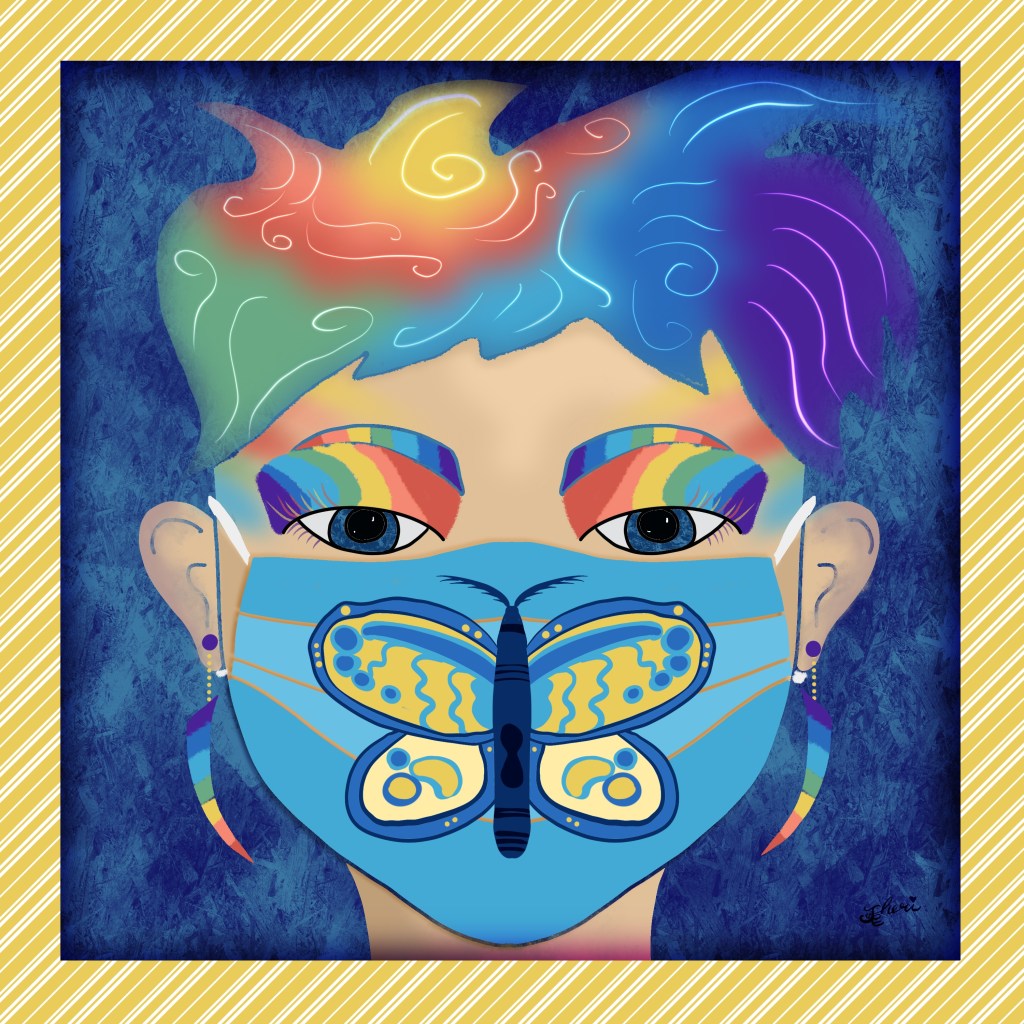 So today I had fun with a face that is socially safe– a bit of rainbow everywhere! And a butterfly– free and fanciful, like our spirits need to be.