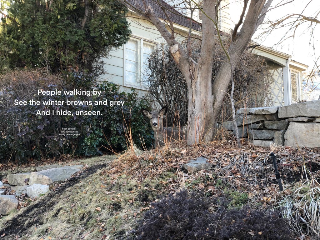 Every day, a photograph, a poem. Today on our walk I stopped twice to say, “Look, a deer,” which Scott did not see. 🙂 I see the hidden deer! Do you see it hiding there?