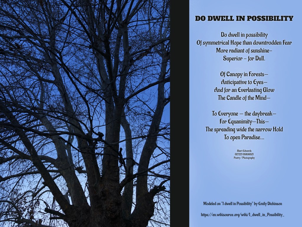 You may notice the poem from my Daily Create post for today. That poem became the focus for my photo today: the canopy of our sycamore in the back yard with the daily light shining through to fit with the poem I wrote as a response to the request in the Daily Create to write a poem on abstract art to which I applied a the model from an Emily Dickinson poem, “I dwell in Possibility.”