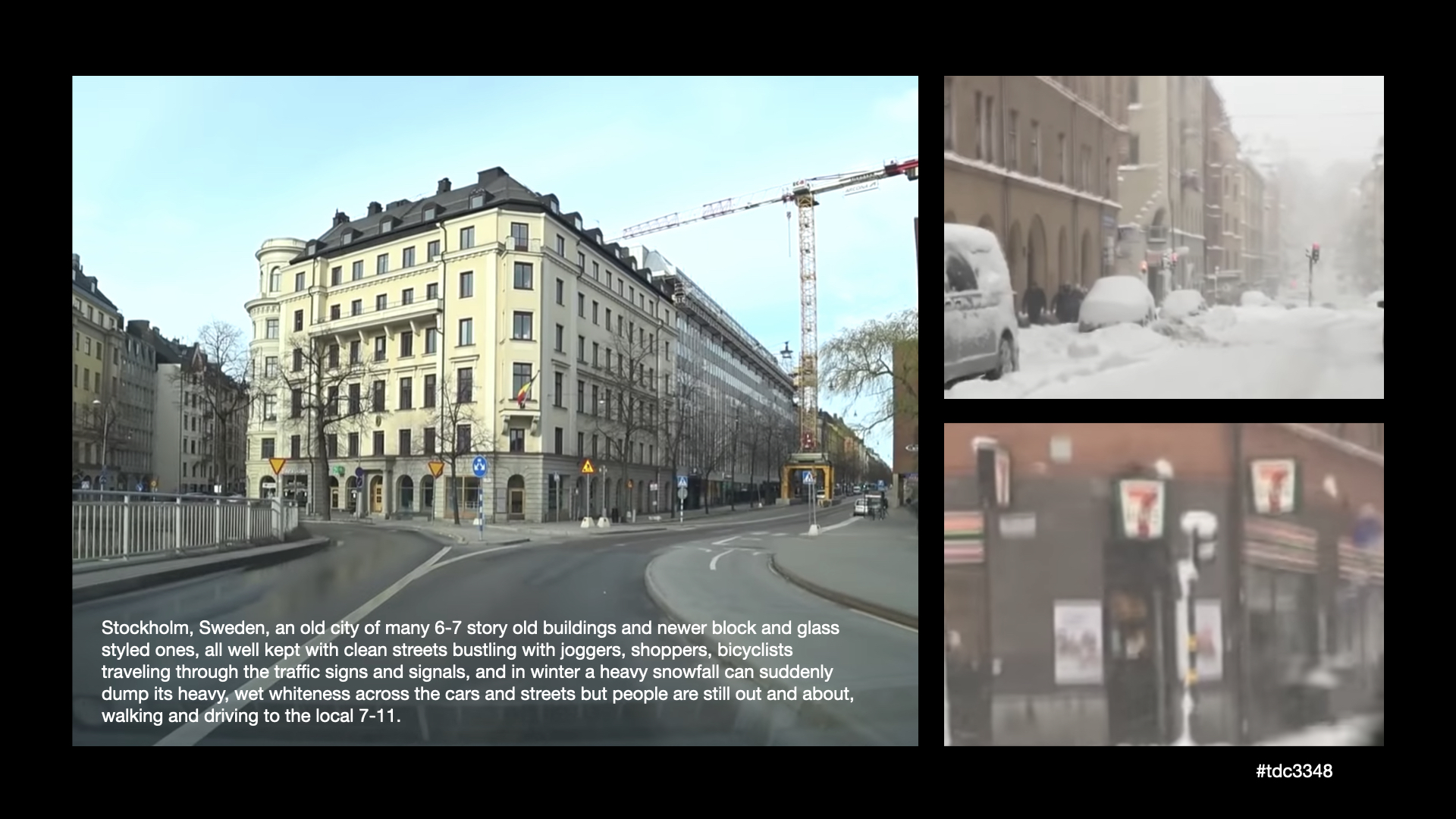 Stockholm, Sweden, an old city of many 6-7 story old buildings and newer block and glass styled ones, all well kept with clean streets bustling with joggers, shoppers, bicyclists traveling through the traffic signs and signals, and in winter a heavy snowfall can suddenly dump its heavy, wet whiteness across the cars and streets but people are still out and about, walking and driving to the local 7-11.