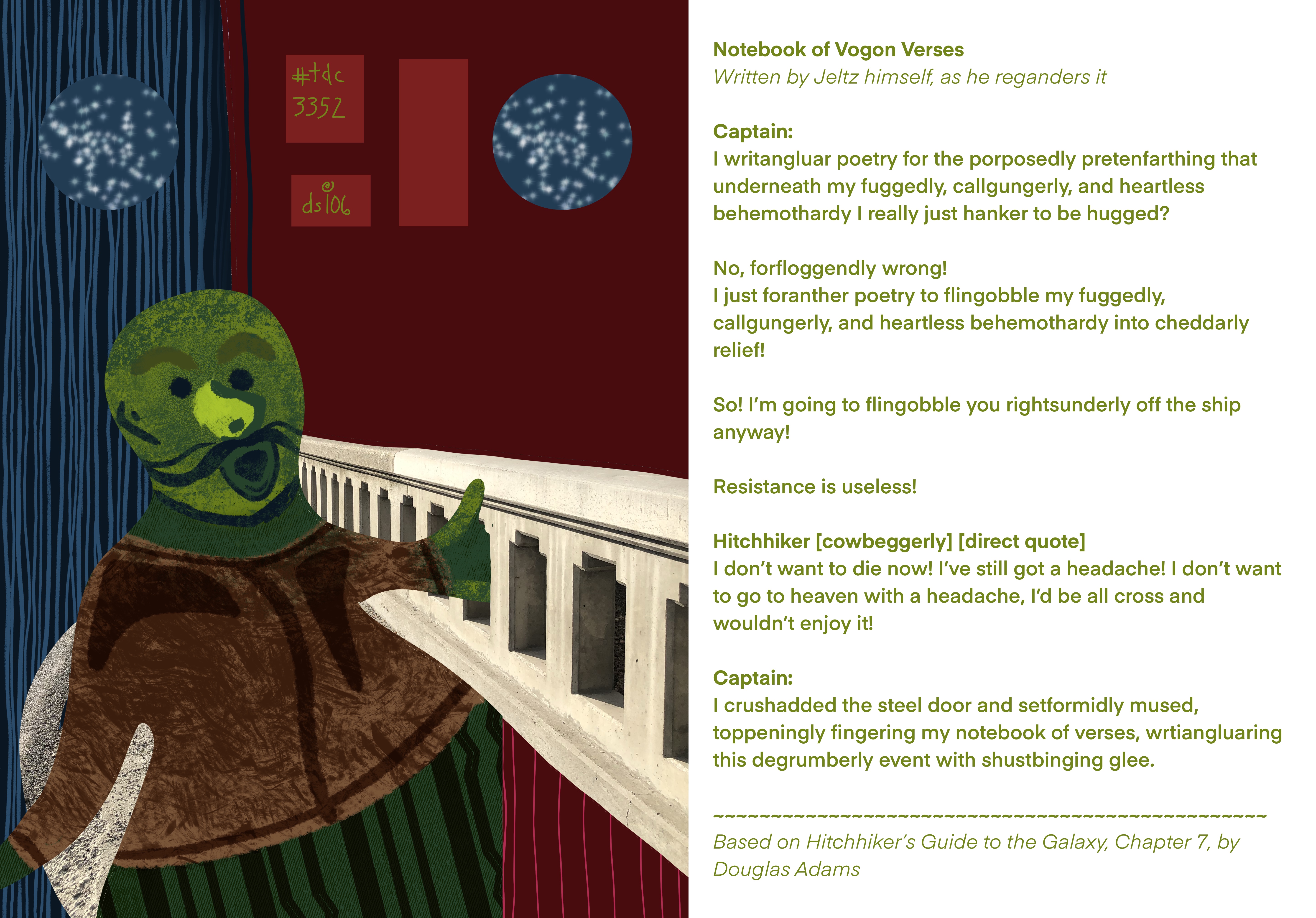 So I opened my “Hitchhikers Guide to the Galaxy” by Douglas Adams to Chapter 7 where Arthur and Ford are forced to listen to the third worst poetry in the Universe, Vogon poetry. I found there an encounter with Jeltz, the captain and decided to recapture the event in a remix with Vogan poetry.