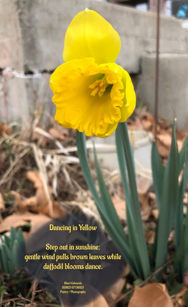 Stepping out for the mail, I was delighted with the yellow daffodil blossoms freshly opened bobbing the gentle breeze so I share it with you!