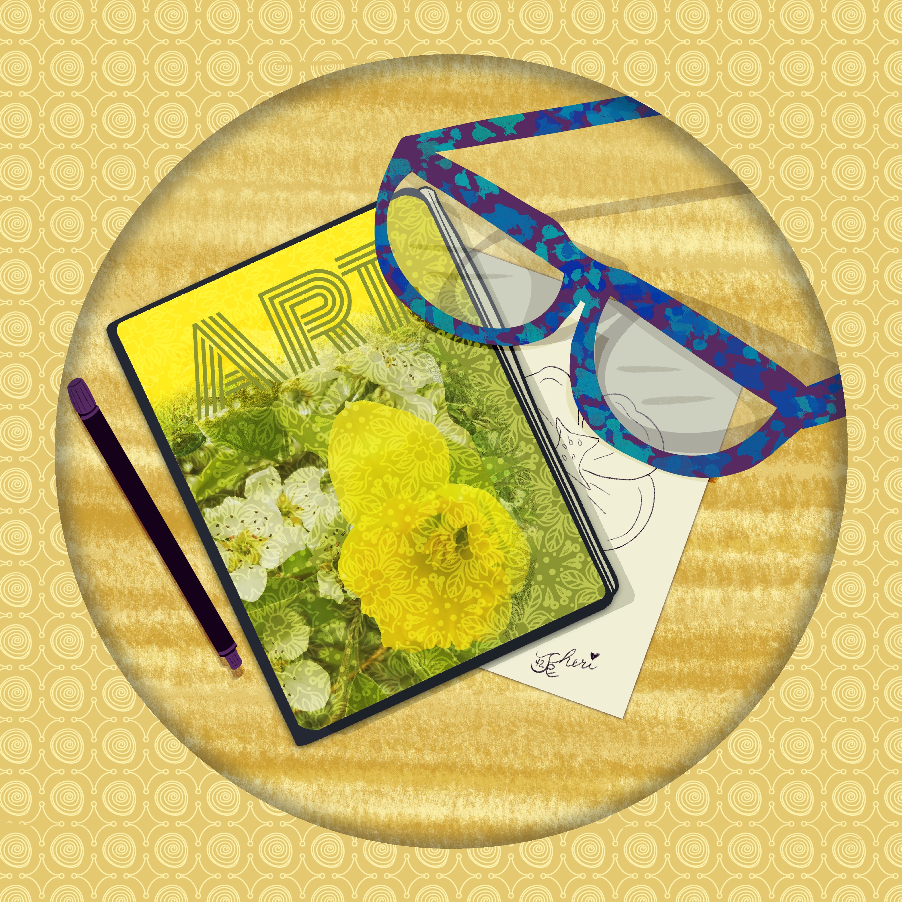Of course my reading material would be art, and I tried to create the texture of the desk and the shadow of and on the glasses, which are close to the ones I do wear. The cover of the “Art Magazine” is a collage of my flowers in my yard– daffodils and pear blossoms filtered through a design stamp I created myself.