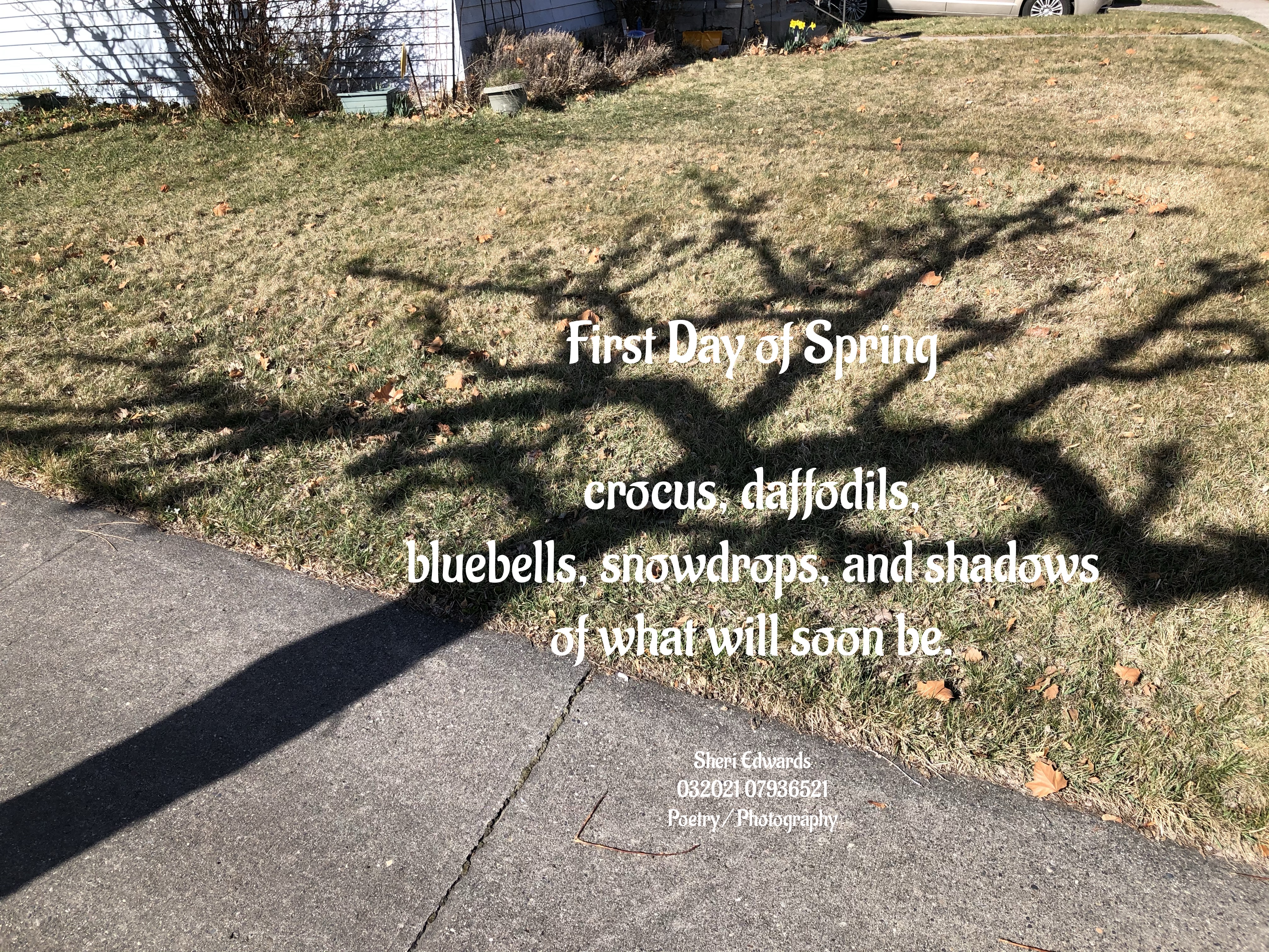 Today I found many pictures of crocus and bluebells and spring things, but what caught my attention was the end of the walk where our crab apple tree’s shadows reminded us of what will still be coming in our beautiful spring and summer.