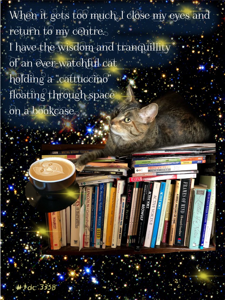 I have the wisdom and tranquillity of an ever-watchful cat holding a “cattuccino” floating through space on a bookcase.