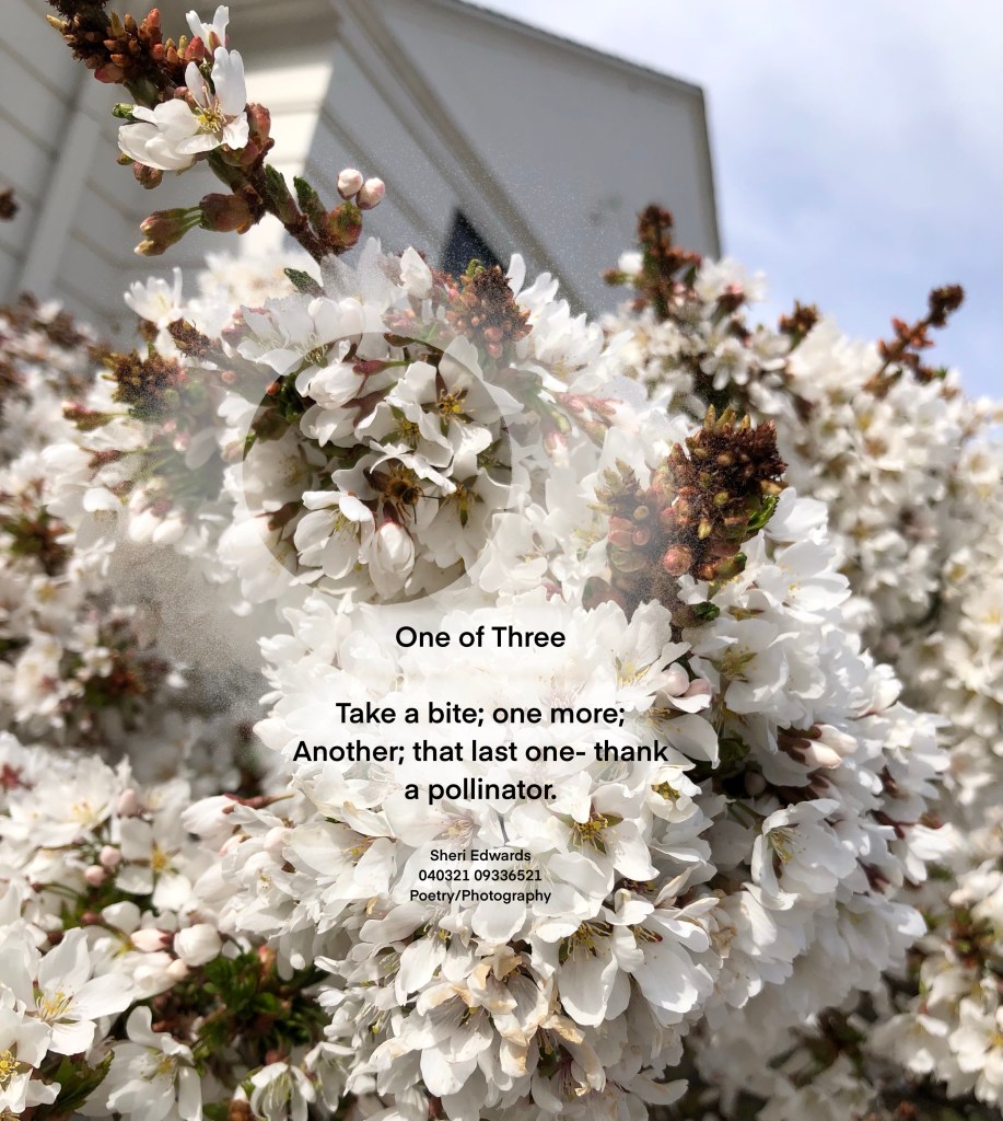 Every day, a photograph, a poem. Today on our walk we passed again the two highly pruned cherry trees in front of the credit union. They are fully blooming and buzzing with all manner of incredible pollinators. Did you know that one out of every three bites of food you take is a result of a pollinator? Programs to help pollinators: pollinator.org Enjoy the slow motion video I took with my iPhone.
