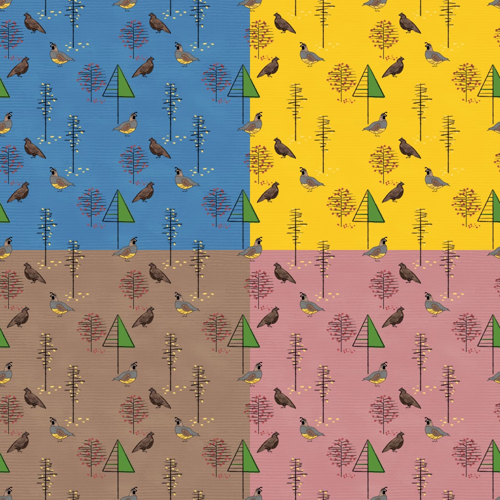 Today I developed the third of the 3×3 challenge to create a winter woods scene. I wanted something stylized and simple. I planned out three simple trees, no evergreen and two deciduous with a few left-over leaves. I also stylized my quail this time while arrange the elements into a pattern.
