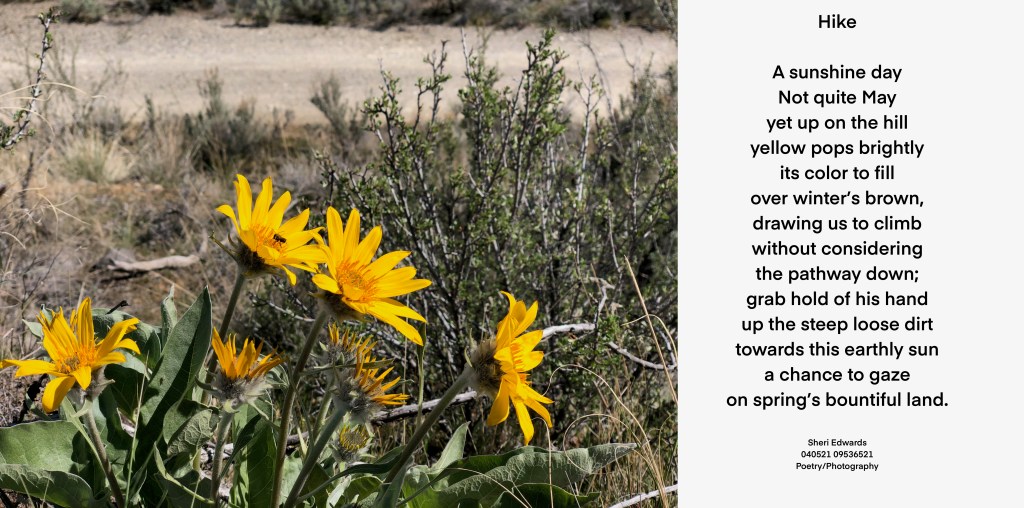 Today was to be a quick walk, but up on the steep hillside, the arrowleaf balsamroot called us with a yellow scream of “I am here again, a sun on earth.” And once we reached its shining petals, we realized the path back down would be too steep for my “stupid” shoes, as Scott calls them. I would have worn my boots had I known we would stop here. So, we continued on the path we knew well from years ago, which would round its way on an easy loop back to our car. Our walk became a lovely walk in the sunshine among the wildflowers.