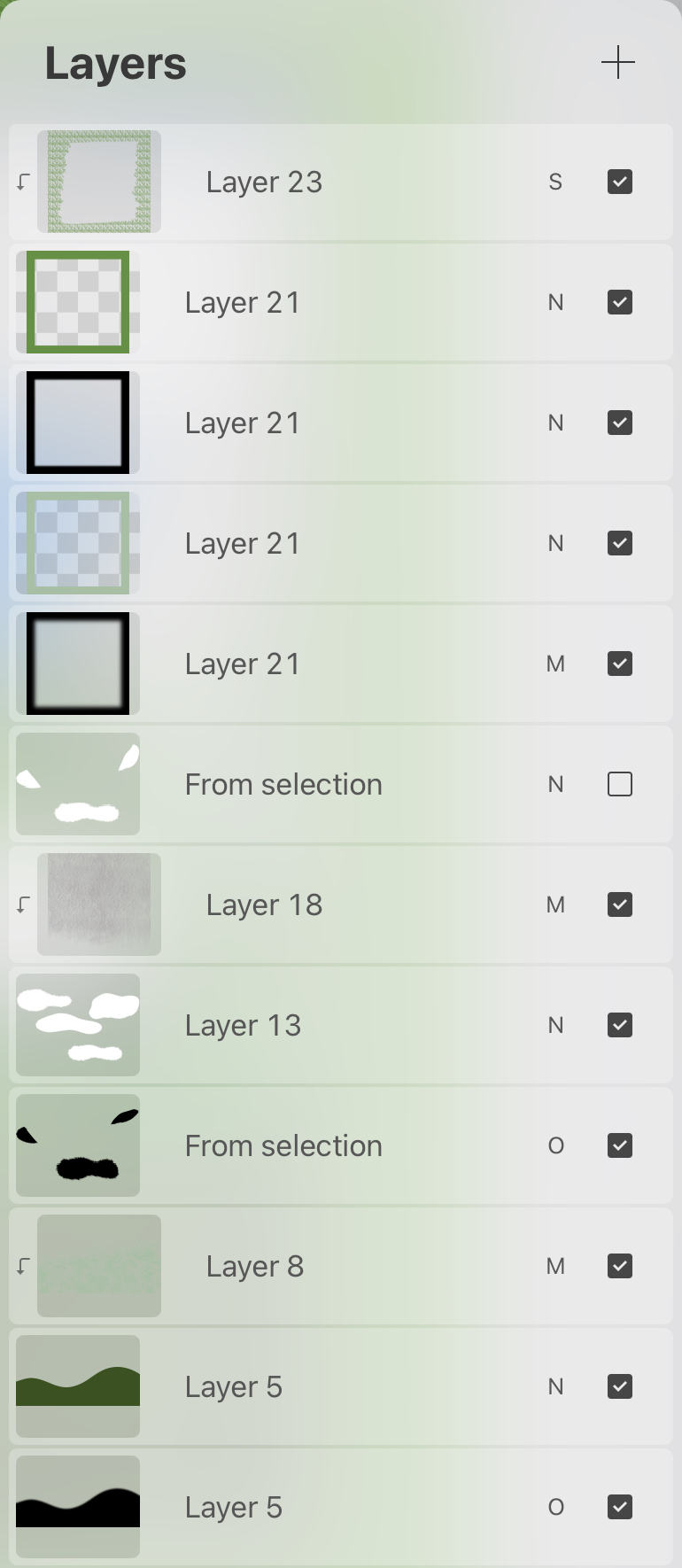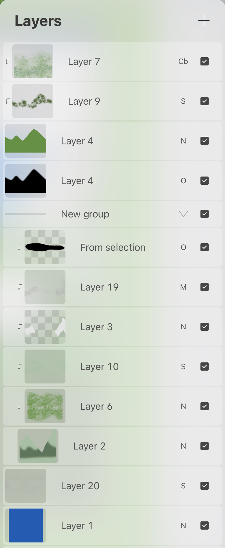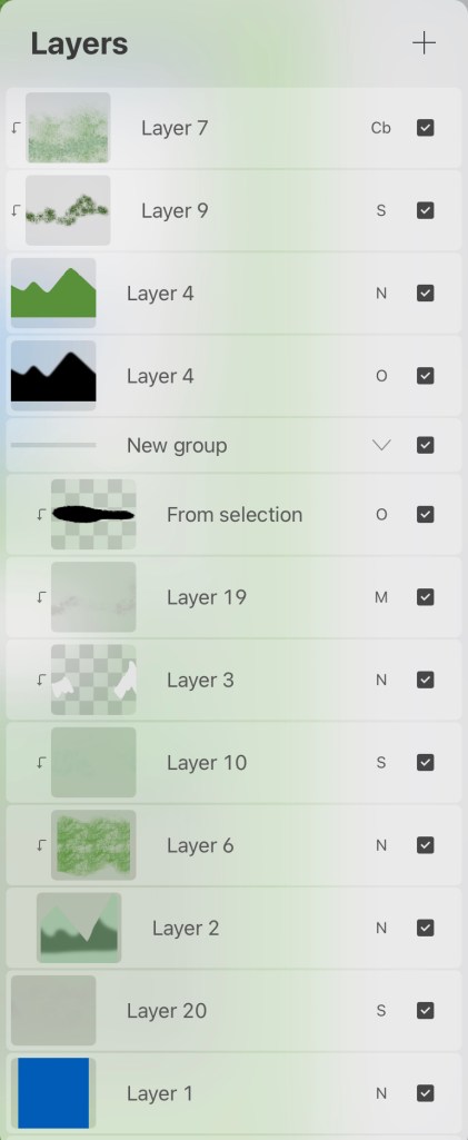 Note: the little arrow icon on the right means the layer is “clipped” to the layer below; the layers with “squares” means its “alpha locked” so only the shape on the layer can be colored. The letters indicate blending modes. The checked box means the layer is visible.