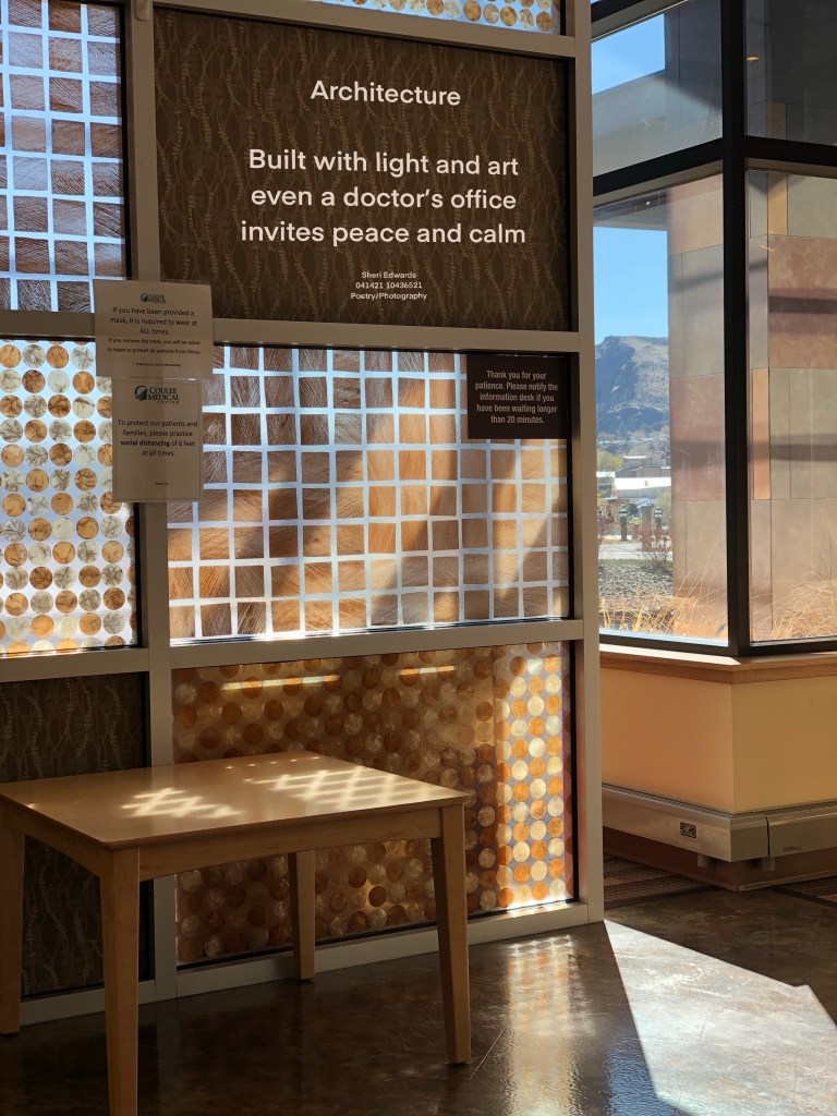 Architecture and interior design are so important. It’s so pleasant in our clinic– the earthy designs and windows let the shadows and sunlight of the coulee inside, and all is peaceful. I love when art and design create that effect; it’s so worth the effort and cost.