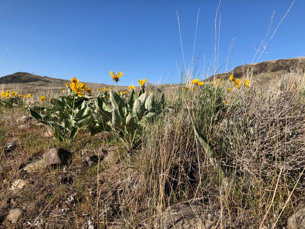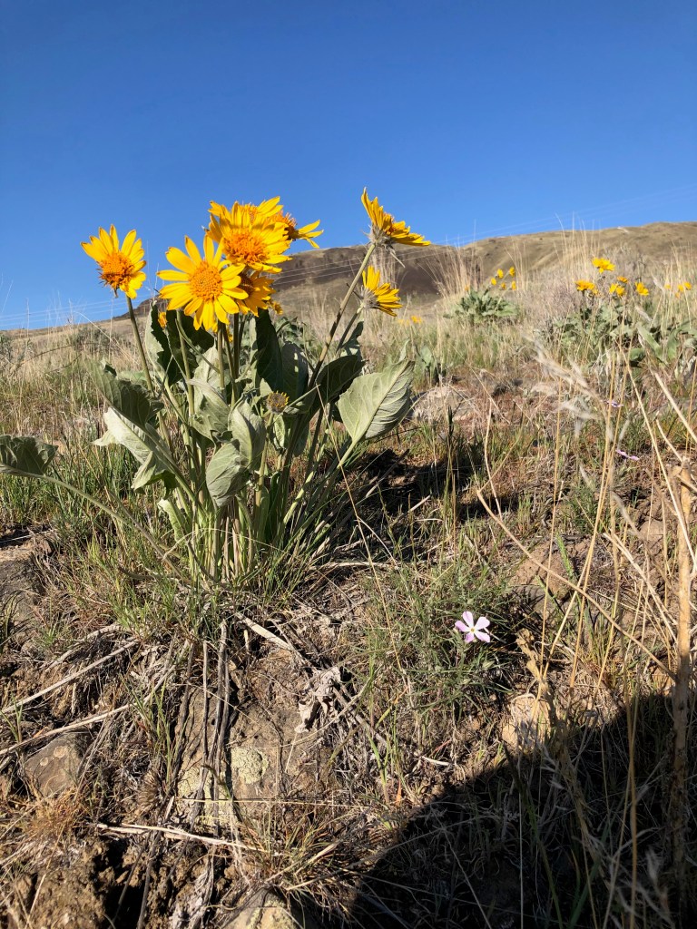 Besides the sagebrush and bunch grasses, we also found arrowleaf balsamroot [sunflowers] and phlox.