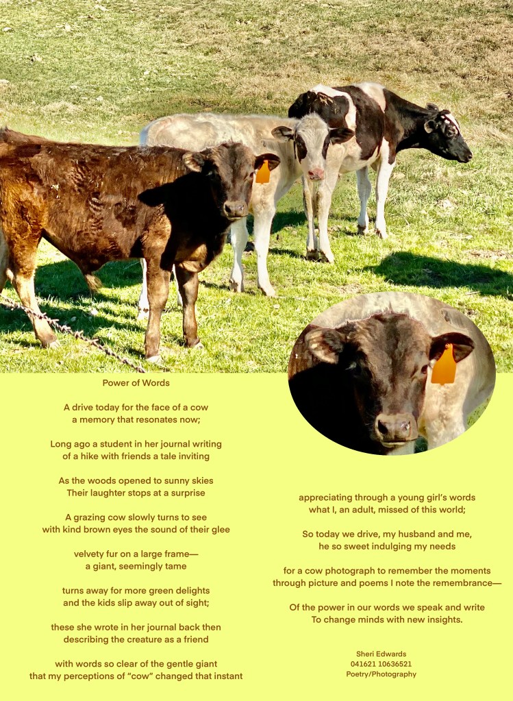 Every day, a photograph, a poem. In today’s Daily Create, we were asked to write an elevenie poem about a cow, which I did and noted that the poem represents a change in my attitude toward cows because of the delightful writing of a former student during our class writing, probably for “Slice of Life.” Slice of Life is sponsored in March for students by The Two Writing Teachers. Slice of Life is also a “Tuesday” thing for bloggers and writers, and in my class that concept was part of our writing routines. Slice of Life– writing about a moment in time with such clarity that others can envision and experience that moment with you. The month of March it was our focus; Tuesdays were Slice of Life days; and since “writing everyday” was part of the class, students could choose that during our journal/daily writing.