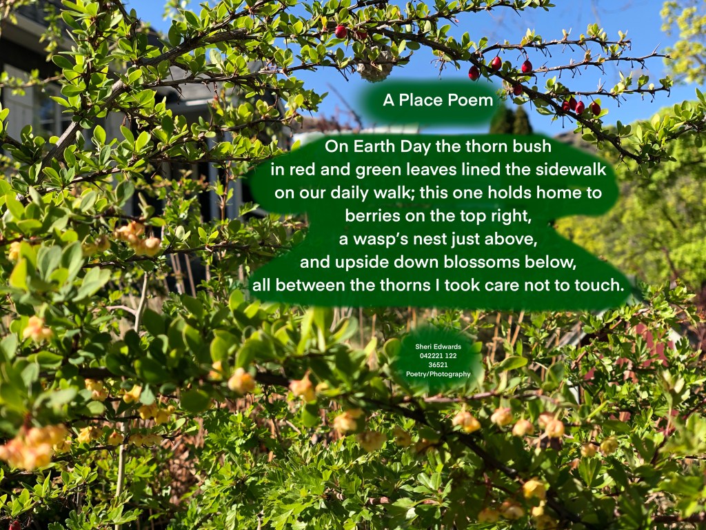 Every day, a photograph, a poem. Today’s poem talks right in the poem about the thorn bush. Hence, a “place” poem. We found two varieties lining the sidewalk of our daily walk: one a love red leaved and the other the usual spring green. But both had delicate flowers hanging upside down between the thorns, and the green one held a wasp’s nest. I could not resist the photo or poem.