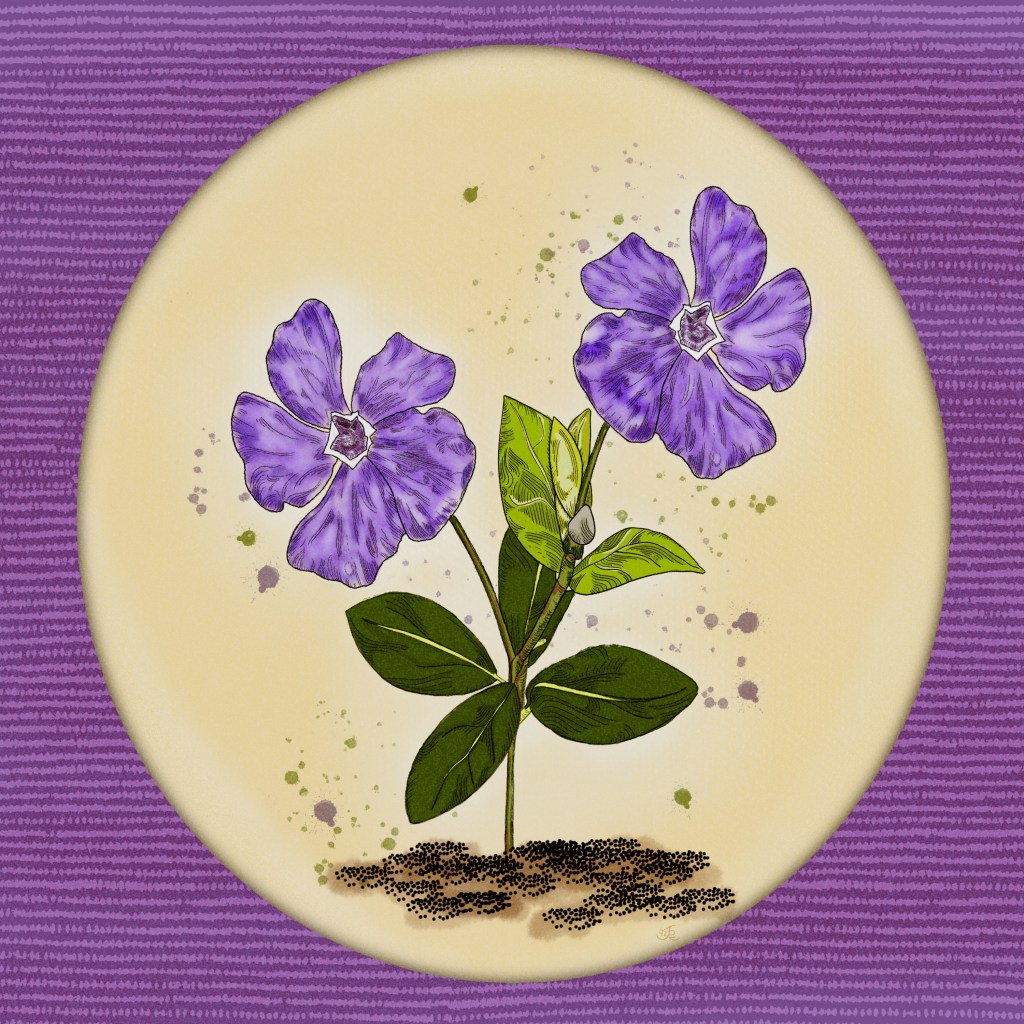 I created the stamps for the floral in three inked line illustrations: the periwinkle, the bud, the four leaves. And, the dirt.