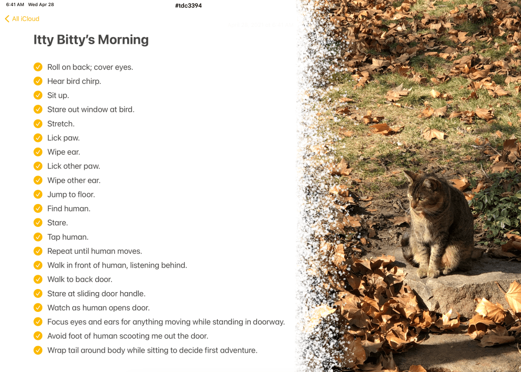 Today’s Daily Create [ @ds106dc #tdc3394 ] is to create a morning ritual checklist of —- I chose our cat! This is exactly what she does everyday. She’s the only cat we’ve ever had who, despite her being a holy terror most of the time, only gently taps us to wake up in the morning. It’s really cute.