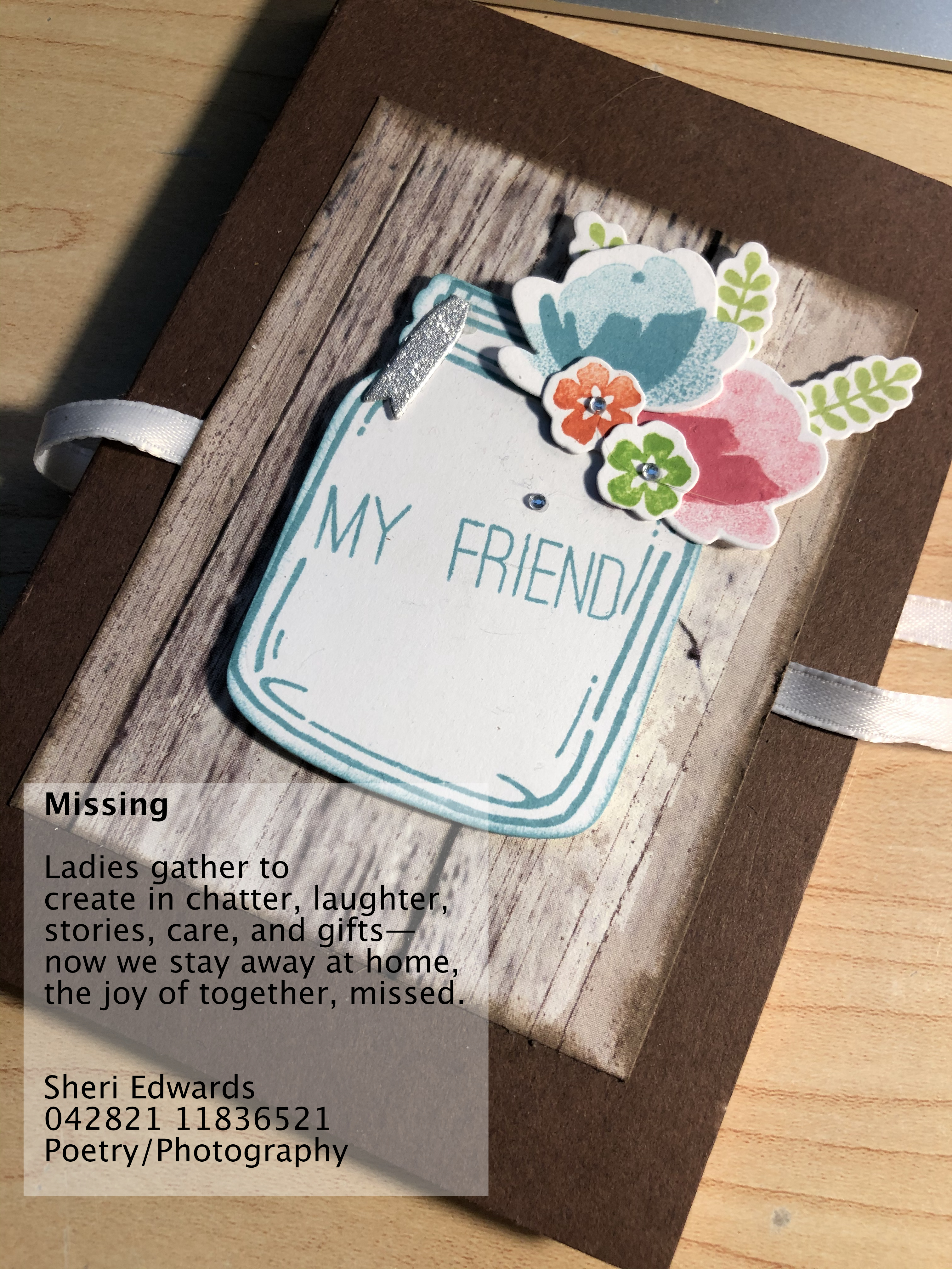Every day, a photograph, a poem. I sat wondering on this cold day of April, what I would notice and note today. As I sat at my computer, I looked down at my notepad, a gift from a friend from two years ago– the last time the “ladies” gathered at Dumas Bay for a stamping retreat. Carol always brings everyone a little gift, like this note pad. I miss the creations we make and share and learn about. I miss our “together laughing” time. Someday, if people get their act together and wear masks, but — you know about that. I look forward to our retreat– maybe next year.