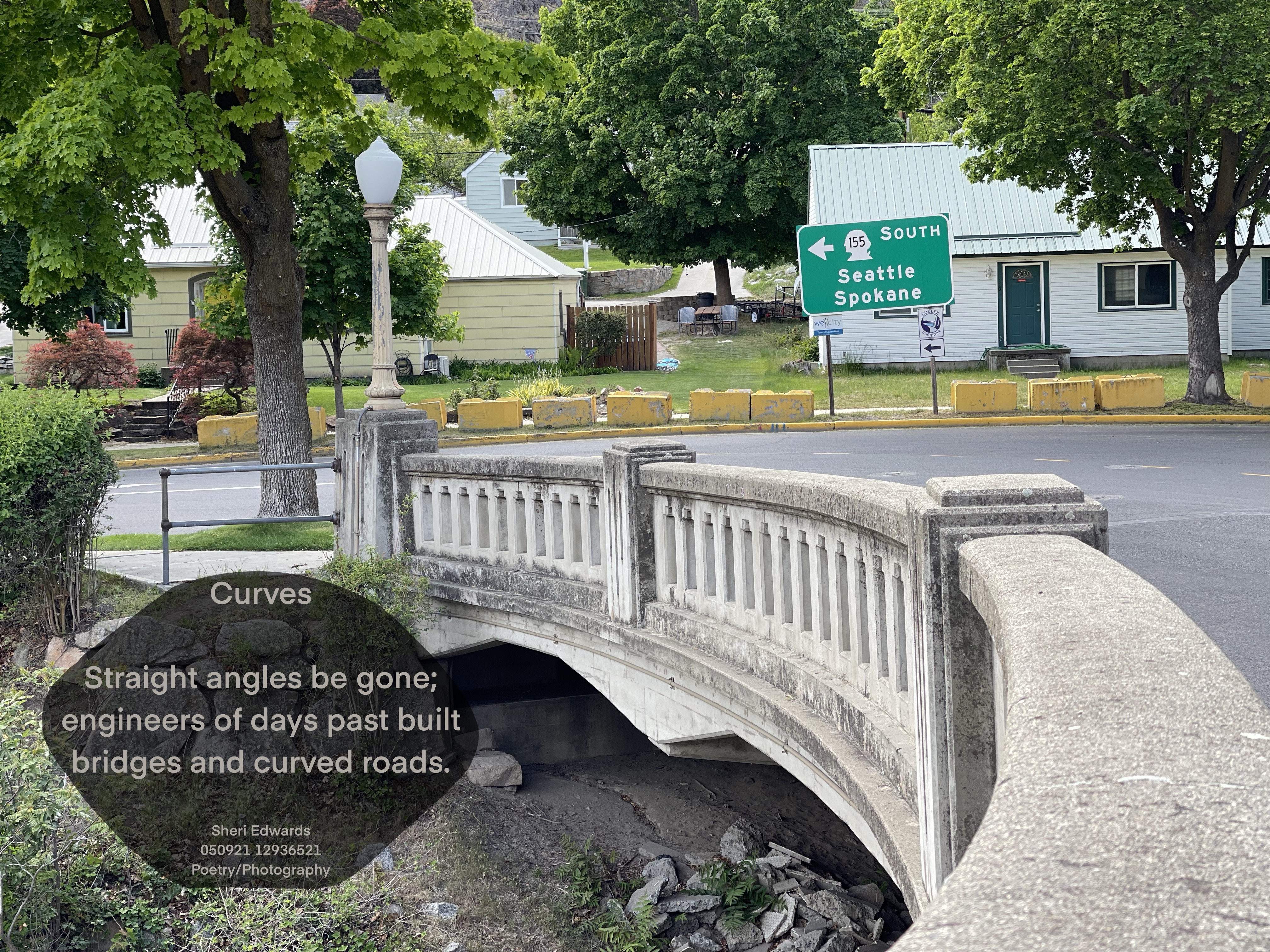 Today on our daily walk we walked along the Grand Coulee Bridge over the Columbia River below the Grand Coulee Dam. As we walked back towards town, I stopped at this view, the gentle curve of concrete with art deco instead of as straight ninety degree road corner.