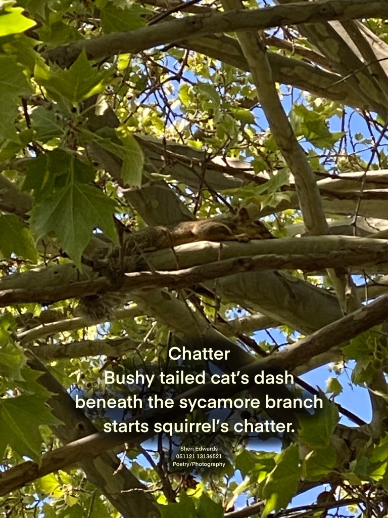 Every day, a photograph, a poem. Today the scolding in the back yard was loud– and stepping out to see what was the matter, my husband found the squirrel in a frantic chatter towards the cat below.