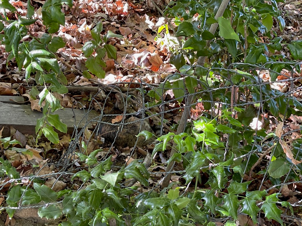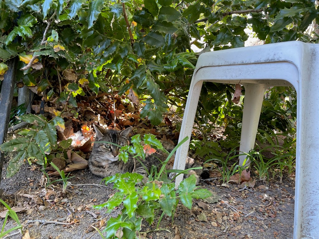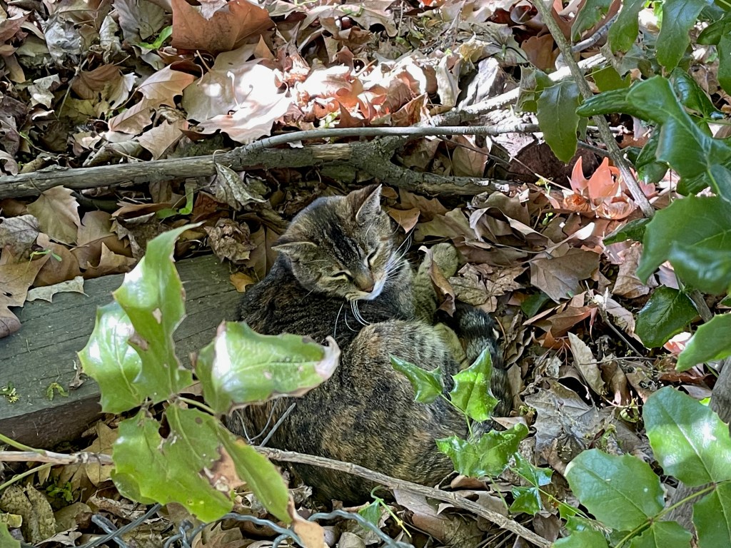 Every day I sneak out and try to discover where the cat sleeps in the afternoon, but she is so camouflaged that I never actually find her, although I’ve found a few places where she’s worn a little curved space into the dust or leaves.