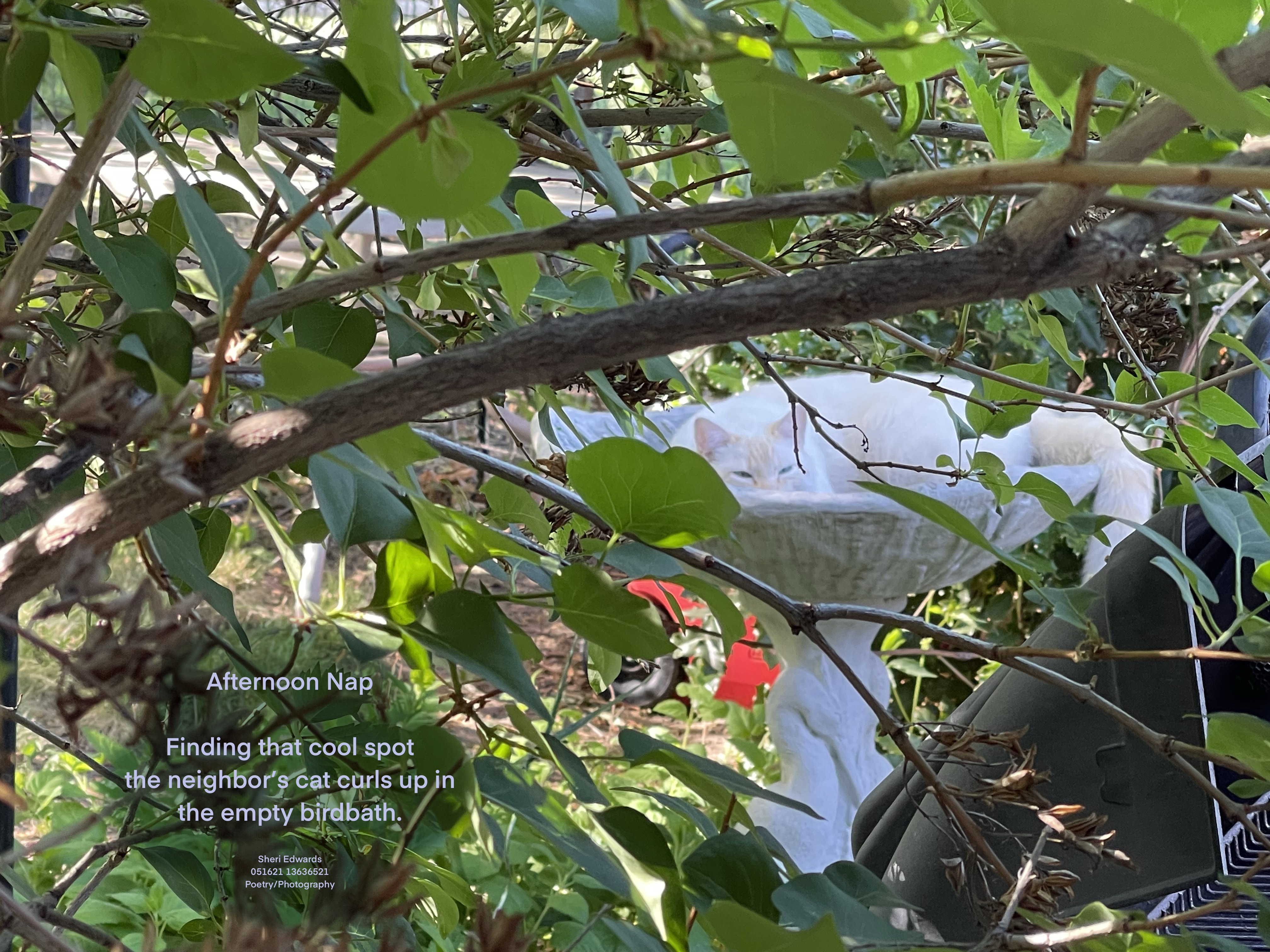 And today I found not only my cat twice, but also the neighbor’s white cat — both in their afternoon “don’t bother me” catnap.