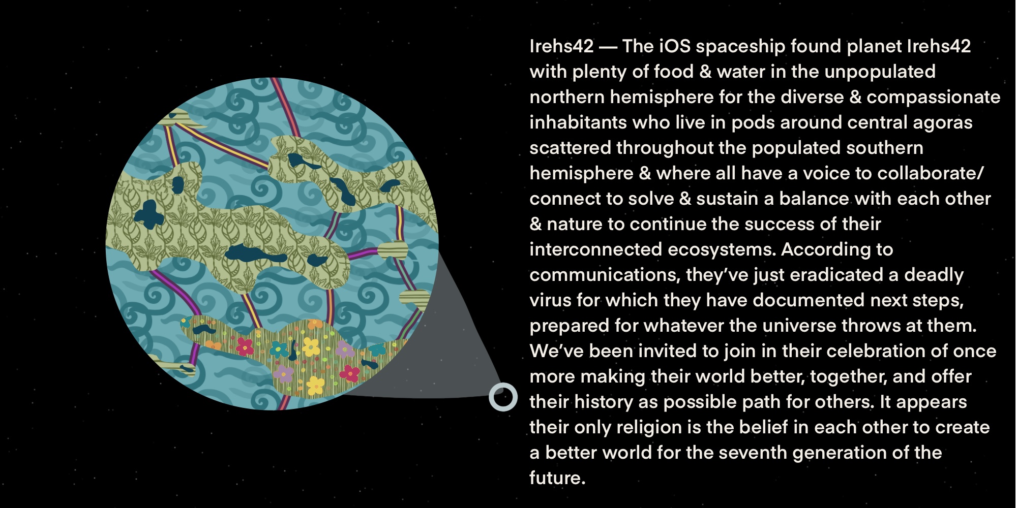 The iOS spaceship found planet Irehs42 with plenty of food & water in the unpopulated northern hemisphere for the diverse & compassionate inhabitants who live in pods around central agoras scattered throughout the populated southern hemisphere & where all have a voice to collaborate/connect to solve & sustain a balance with each other & nature to continue the success of their interconnected ecosystems.